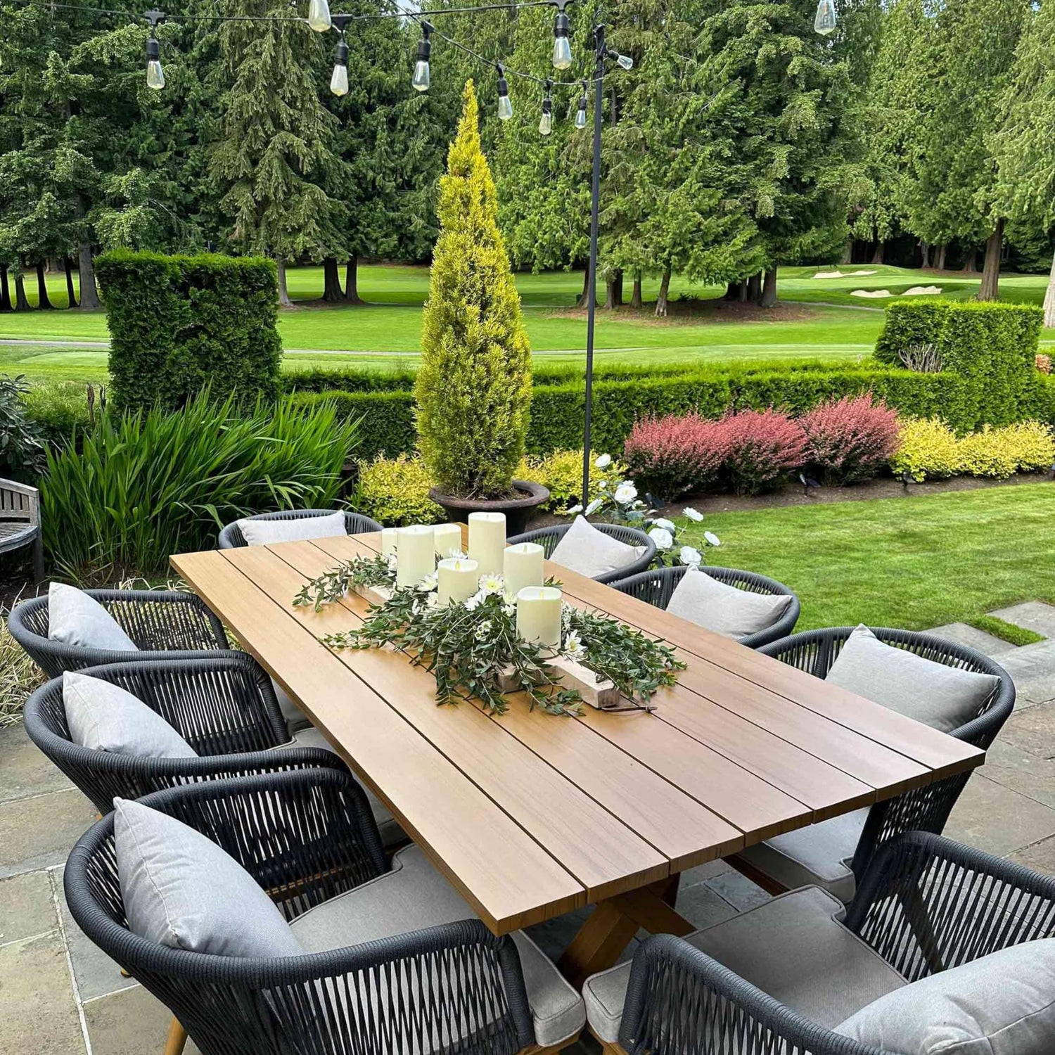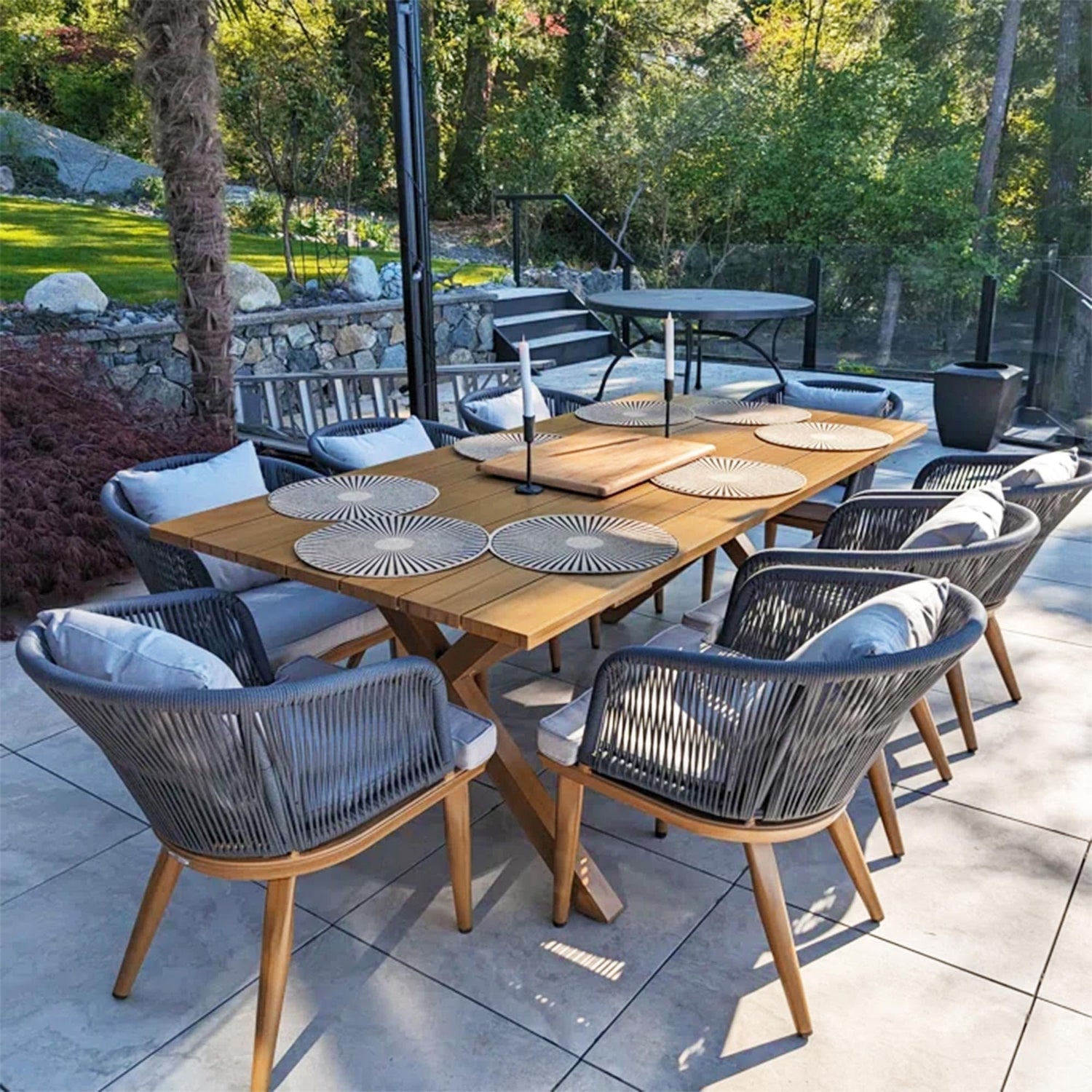 - All-weather teak dining table set: Includes 1 rectangular table (80.71"L x 38.39"W x 29.53"H), 8 chairs (19.69"W x 19.69"D x 29.92"H, 16.54"SH) with 8 seat cushions and 8 back pillows.