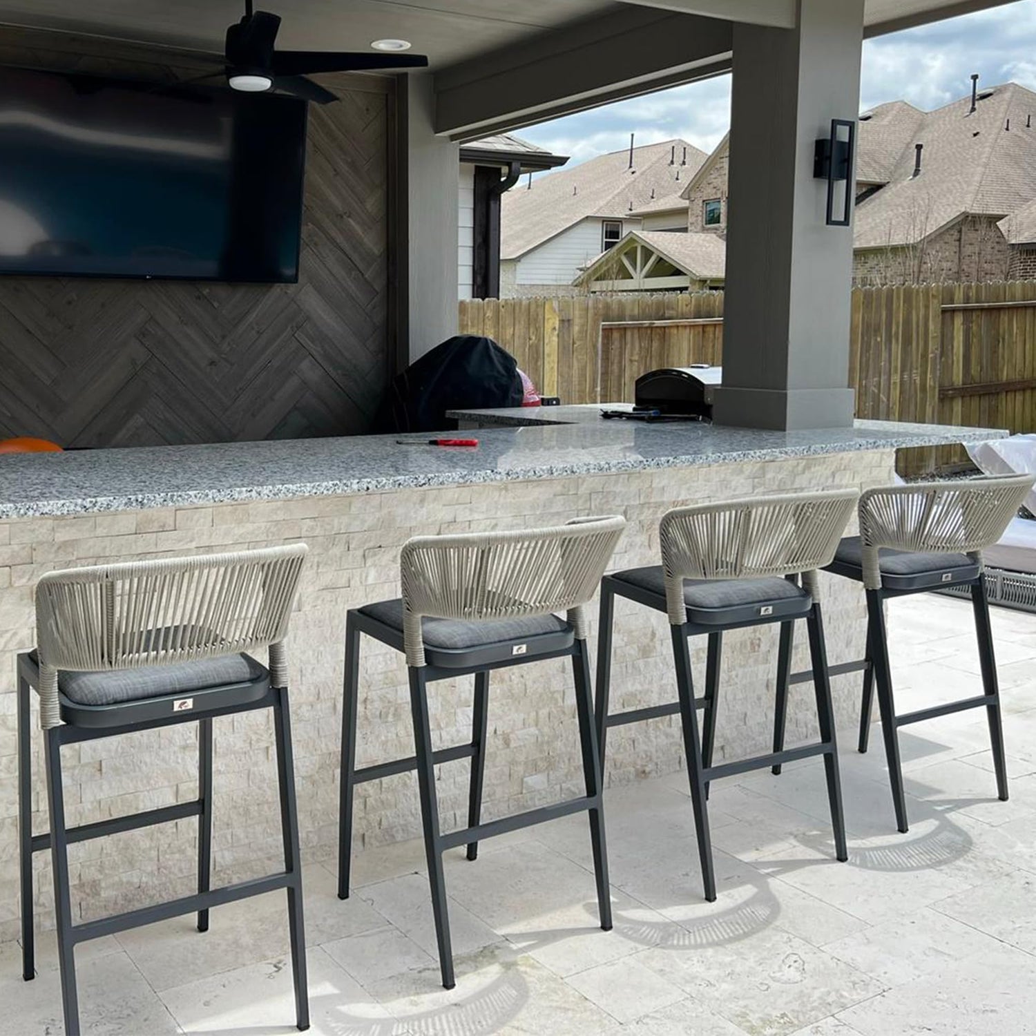 - Modern Style: Combining a classic grey finished aluminum frame with a neutral-toned rattan weave, this bar stool will be an ideal modern accessory for your outdoor space.