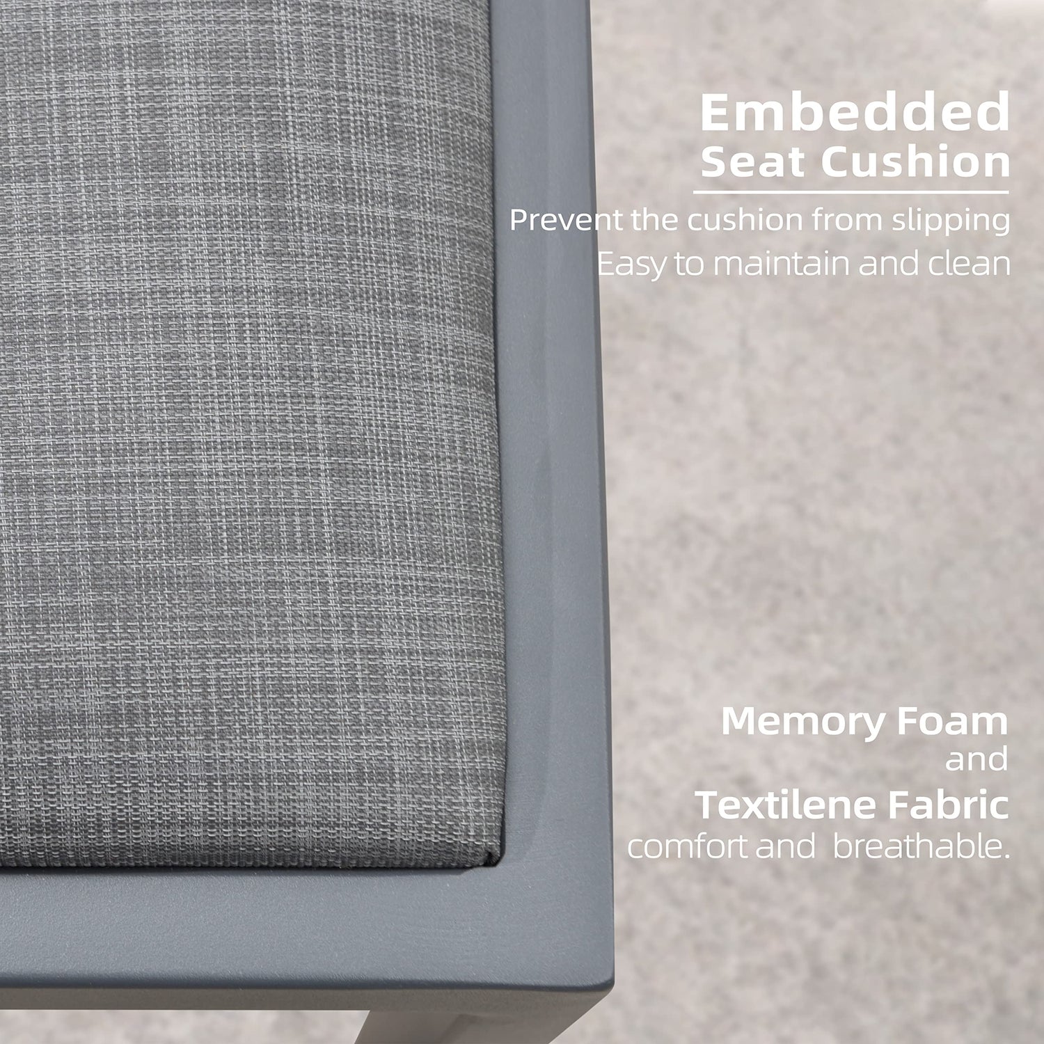- Embedded Seat Cushion: The seat cushion is constructed of memory foam and breathable Textilene fabric for comfort and easy cleaning. Embedded design prevents the seat cushion from slipping.