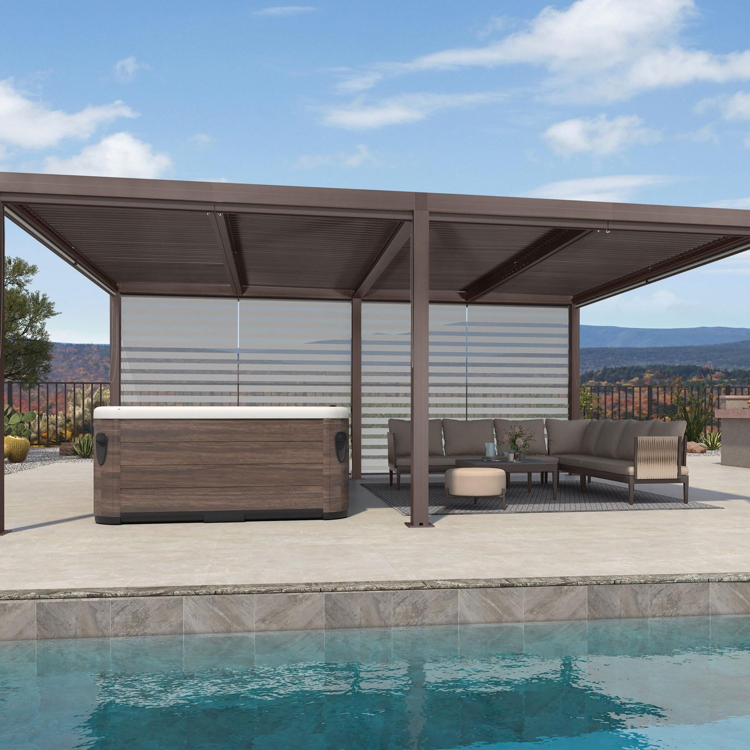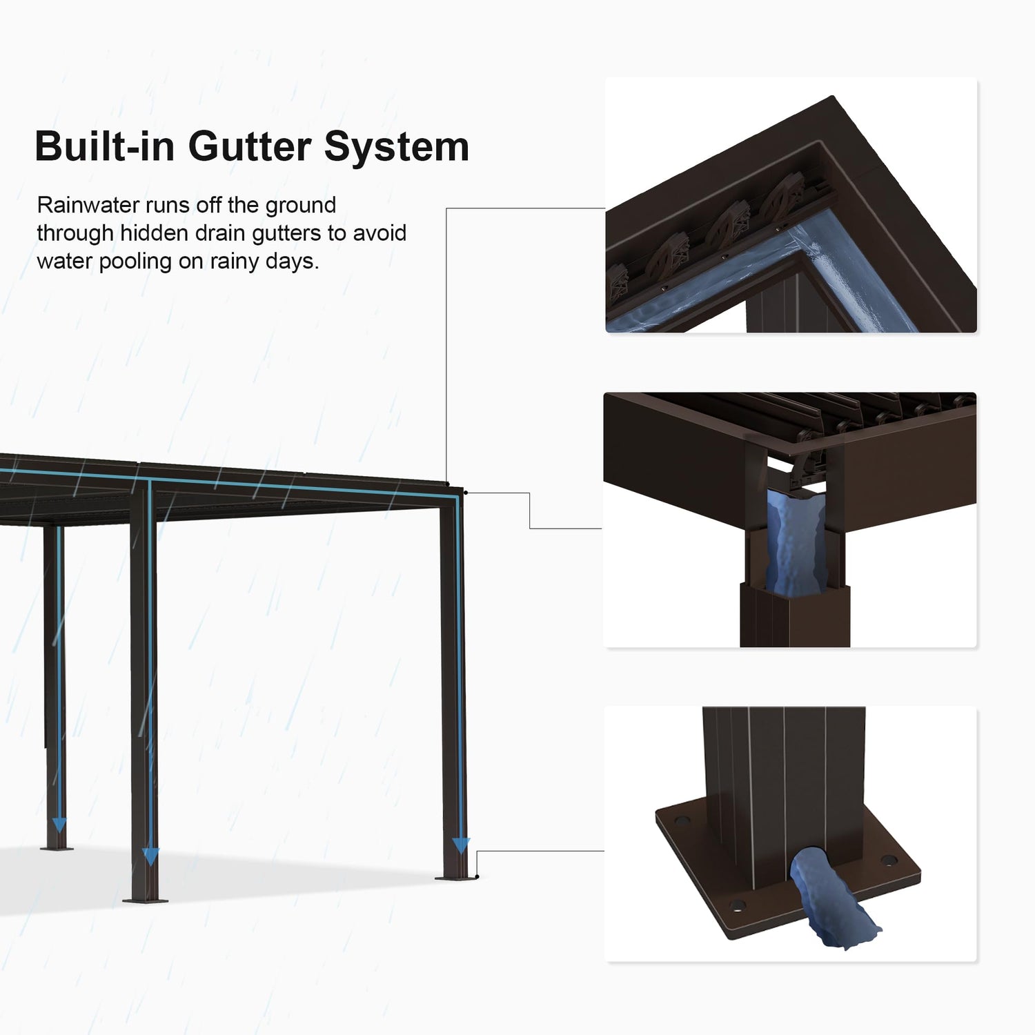 - Hidden Water Gutter Design: The advanced integrated drainage system effectively diverts rainwater from the louvers into the posts in four directions and then to the ground, preventing water accumulation on the roof.