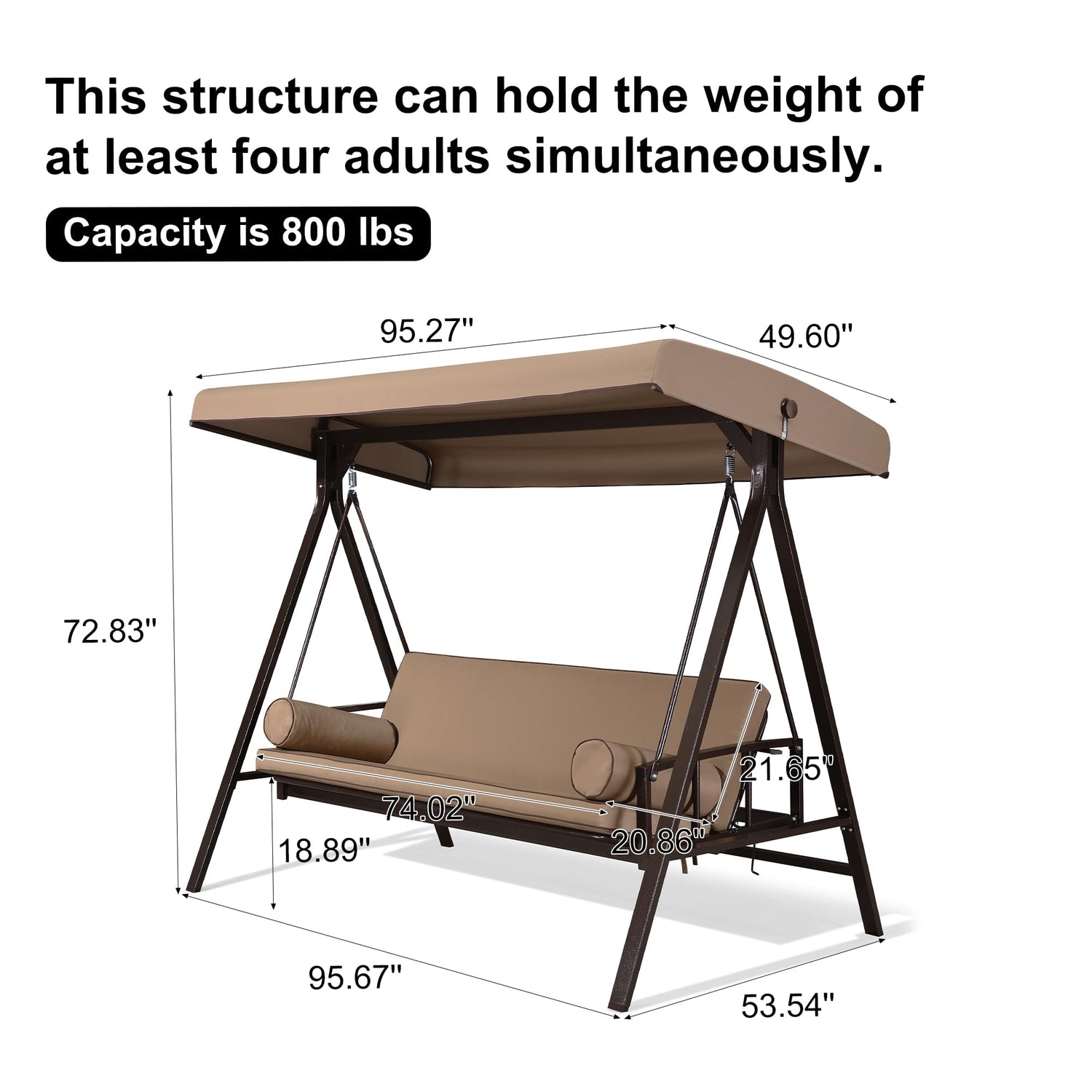 PURPLE LEAF Outdoor Patio Porch Swing Adjustable Backrest, 3-seat Swing Chair with Weather Resistant Steel Frame for Backyard Front Porch Lawn, Cushion and Pillows Included, Beige
