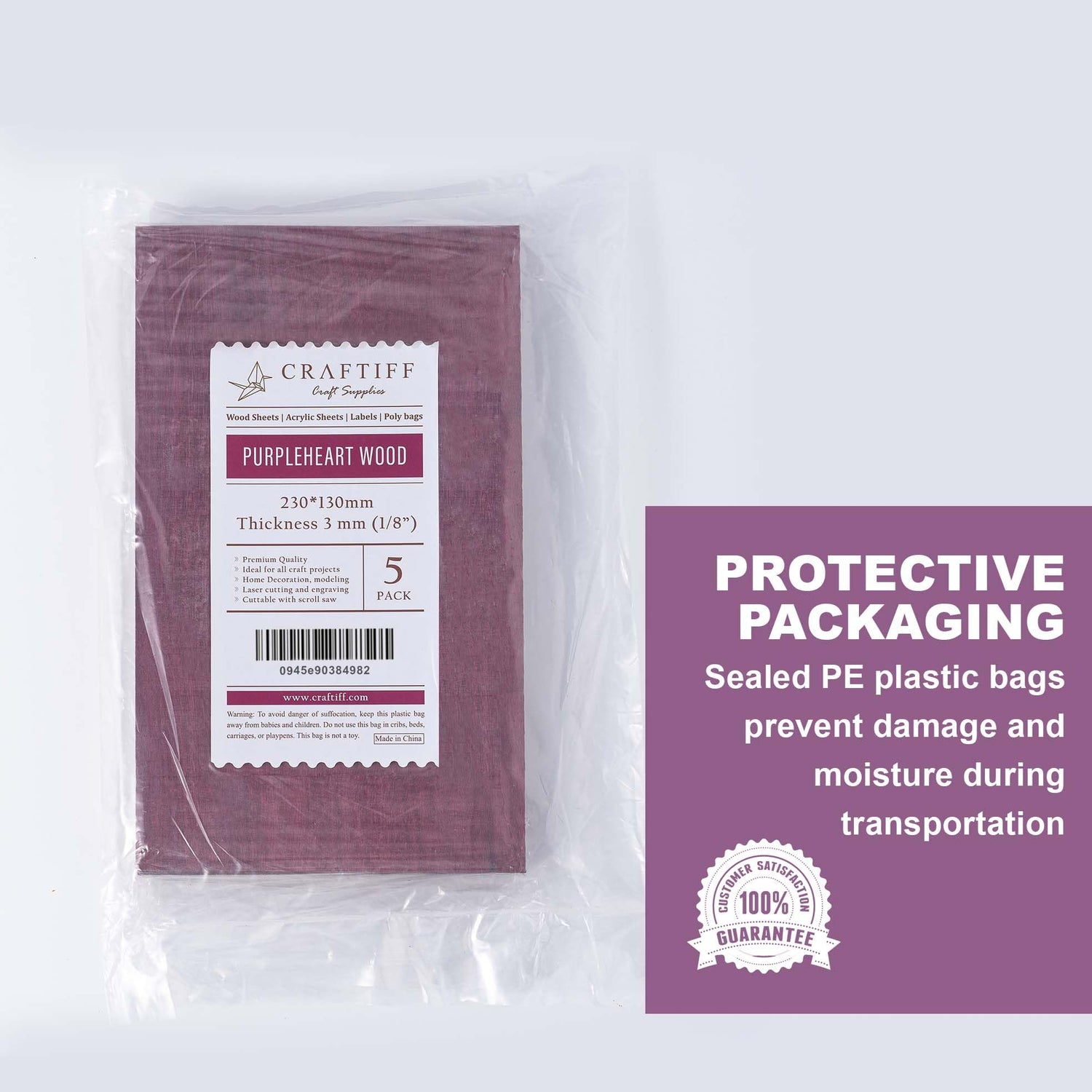 Details: 【MATERIAL】: Purple heart wood with beautiful grain. Color varies from purplish brown to eggplant purple. Sometimes dark brown with a hint of purple. Unfinished, hard, dense and tight-grained purpleheart lumber board. 【DIMENSION 】: Five pieces of 9 x 5 inches (230*130 mm) with a thickness of 1/8 inch (3mm) purpleheart wood. 【USAGE】: Perfect material for DIY projects, accessories, small furniture, coasters, and etc. 【DETAILS】: Engraving, Laser marking and cutting friendly, high workability. May require saw blades and drill bits to cut and shape, can be polished with sandpaper. 【PACKAGING 】: Thick PE plastic bags to protect the bundle of purpleheart wood from bending and scratches during transport.
