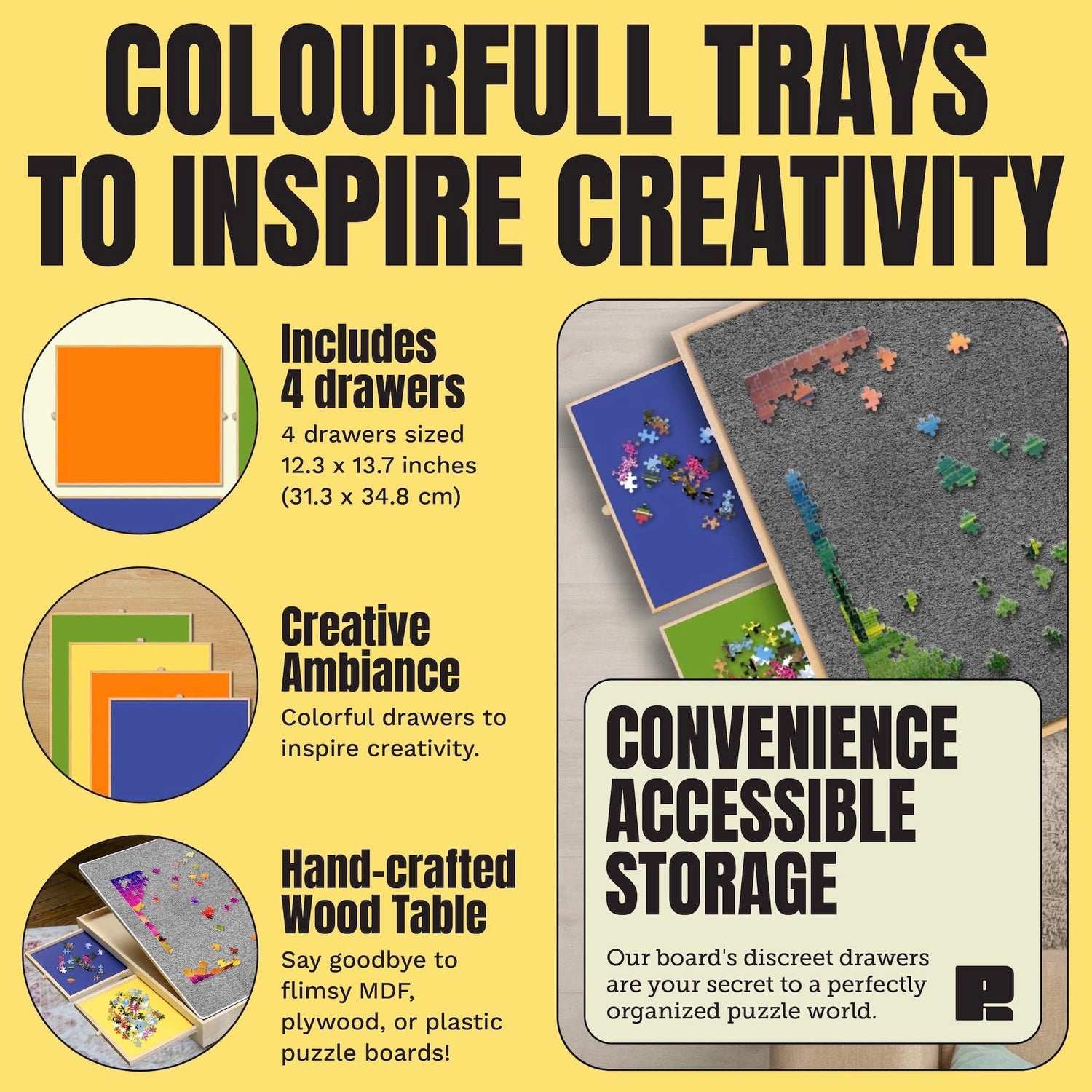 - 🧩 Portable Puzzle Board with Drawers - Simply cover the Board game table and put it away when you need extra space for seating or dining. Easily lift with Carrying Handle for quick Puzzle storage. In a matter of seconds, you can cover your puzzle with the unique Puzzle Ready Puzzle Mat and tuck it away under a couch or bed for safekeeping.