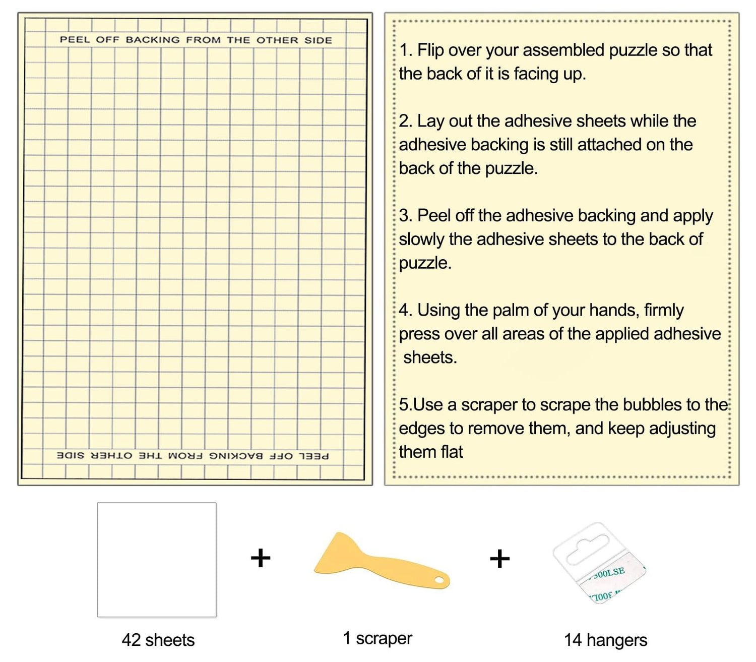 - 【Easy Usage】Simply peeling the backing from the puzzle sticker sheets and stick to the back of your finished puzzle, using the scraper to help you remove bubbles between puzzle and adhesive sheet better, then hanging your saving puzzles by adhesive hangers.