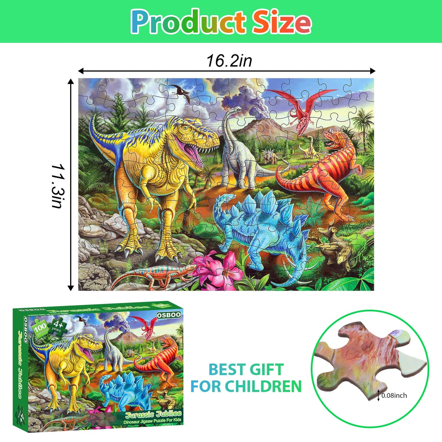 - đŠăPackage Containă100 piece dinosaur jigsaw puzzle and a reference poster that helps young children to finish the puzzle. Precision-cut pieces and each piece has a completely unique shape that fits together perfectly. Pieces are larger and thicker than normal puzzles. Finally finished size: 16.2 x 11.3 inch/41 x 28.8 cm.