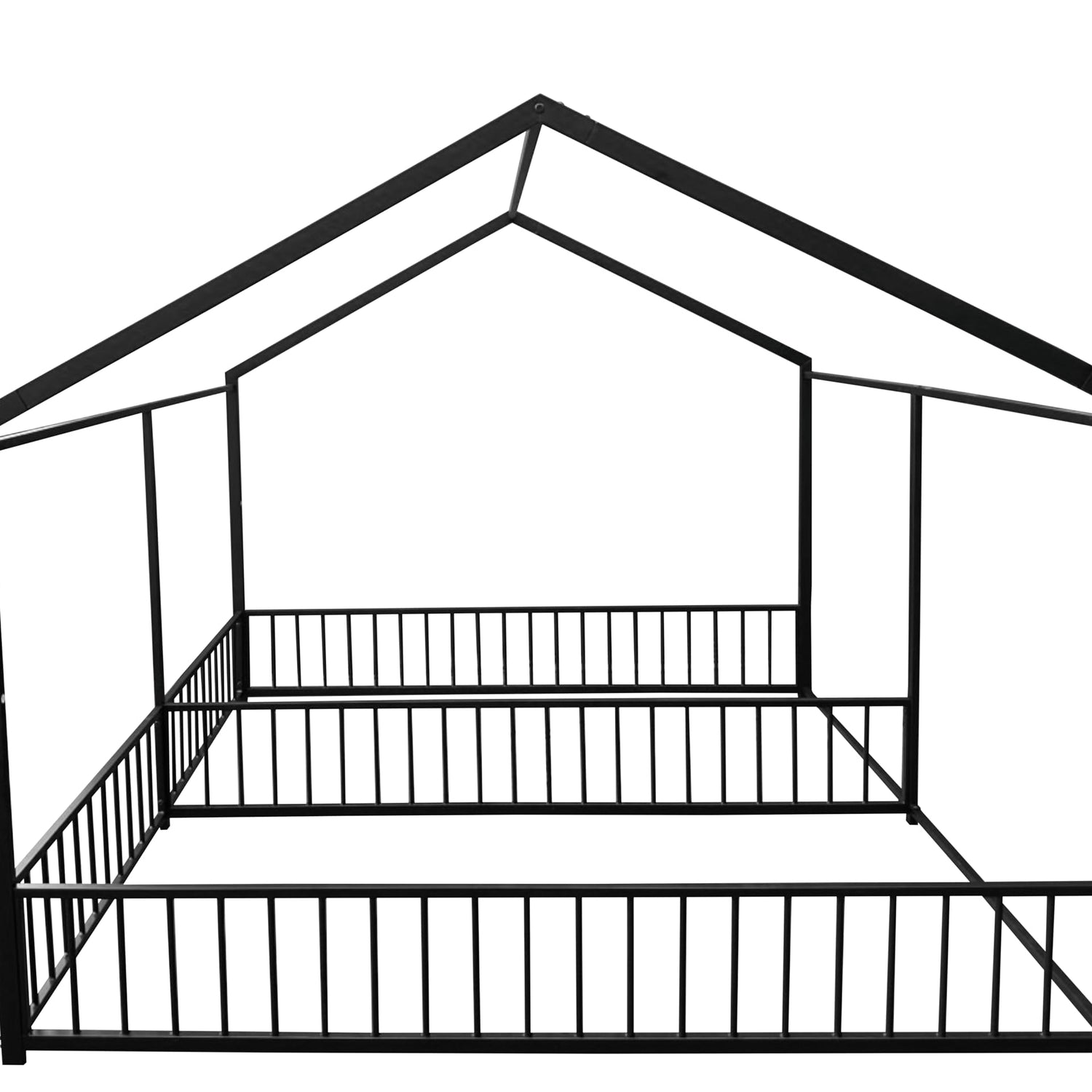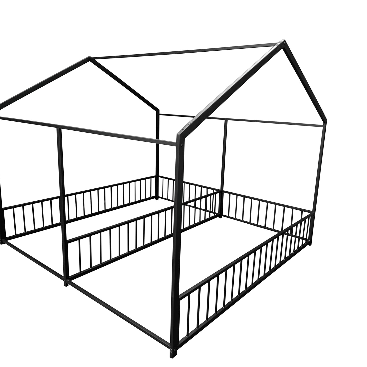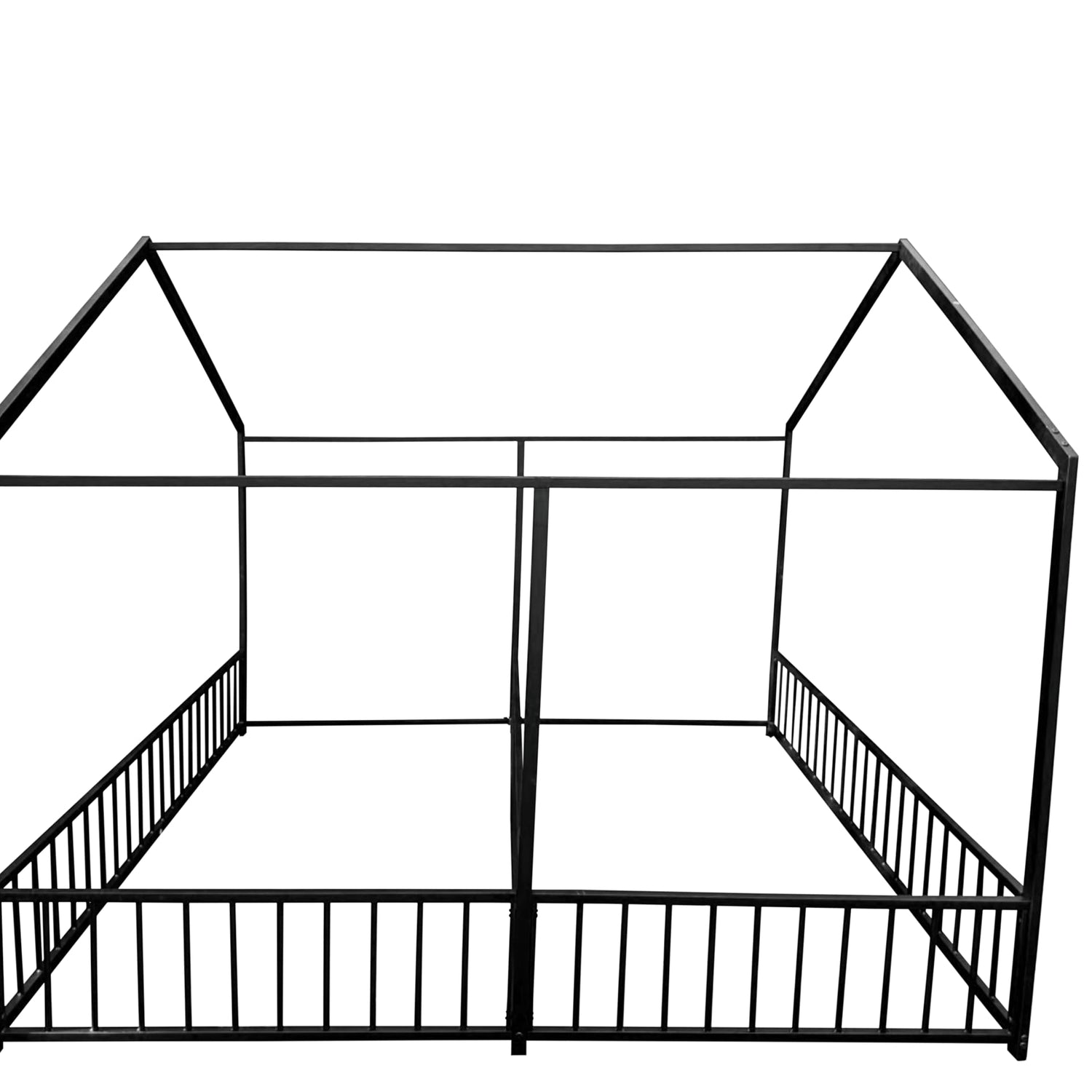 PVWIIK Double Montessori Floor Bed with Fence & Roof for Two Kids Teens Boys Girls,Twin Floor Bed,Easy Assemble,No Box Spring Needed, Black