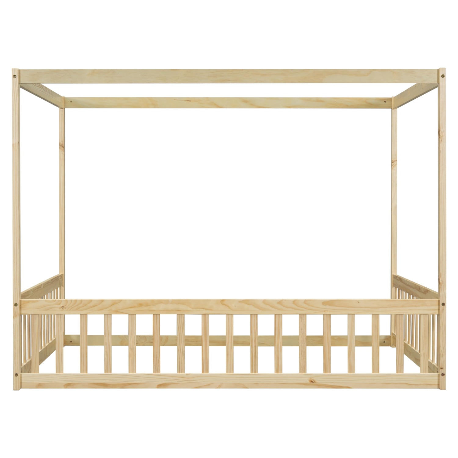 PVWIIK Full Size Canopy Frame Floor Bed with Fence for Girls & Boys,Montessori Floor Bed w/Safety Guardrails for Girls,Boys,No Box Spring Needed, Natural