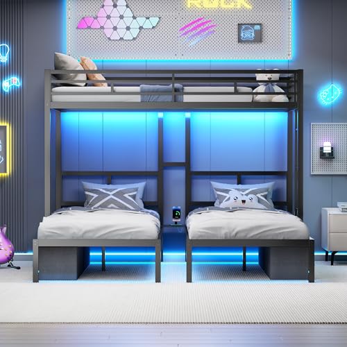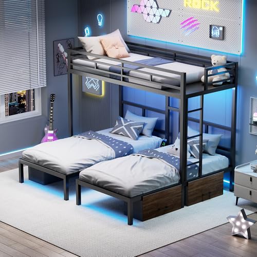 PVWIIK Heavy-Duty Triple Bunk Bed with 2 Storage Drawers & USB Charging Station,LED Triple Bunk Bed Frame with Built-in Ladder & Full-Length Guardrails,Easy to Assemble,Space Saving, Black
