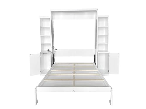 PVWIIK Queen Size Murphy Bed with Desk & Charging Station,Wall Bed Frame Folding into Cabinet Design w/LED & Storage Shelf for Small Space,Bedroom,Guest Room,White