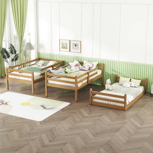 - [Safety and Quality Guaranteed]This bunk bed is crafted mainly from high-quality solid rubber wood, providing lasting sturdiness and durability. The two built-in ladders are constructed with firmly secured steps, forging solid stability that leads to middle bunk and top bunk respectively. The triple bunk bed features full-length guardrails on the upper and middle bunk to prevent accidental falls.