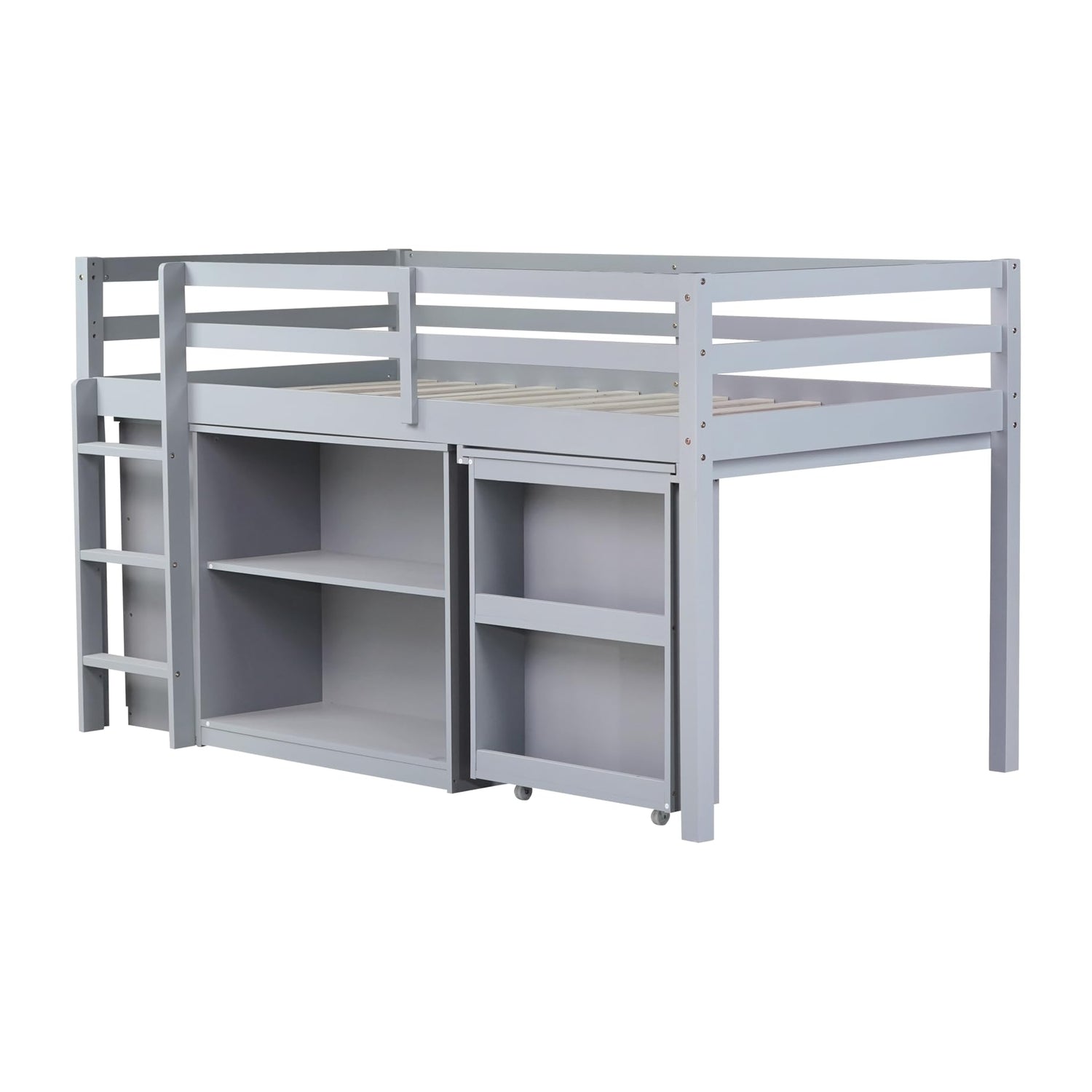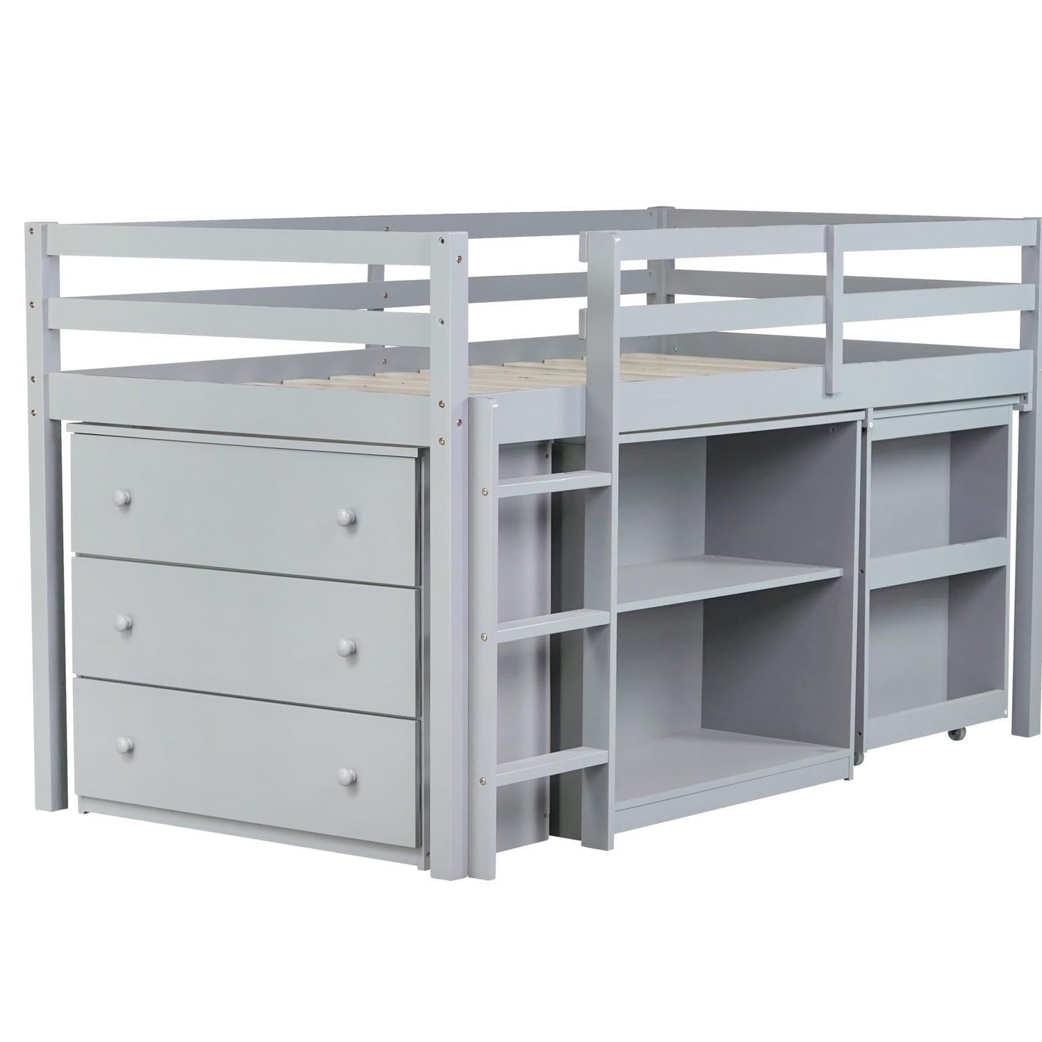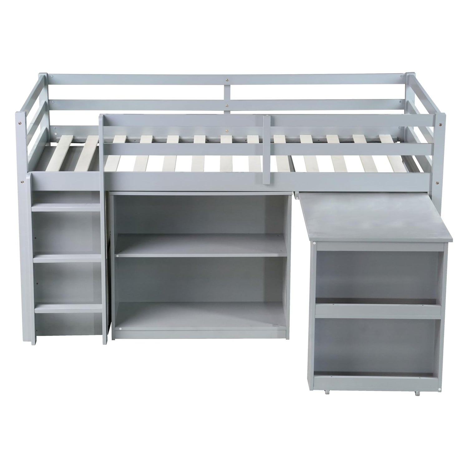 PVWIIK Twin Size Low Loft Bed with Desk & Storage Drawer for Kids,Wood Twin Loft Bed with Shelf,Space Saving,No Box Spring Needed,Grey