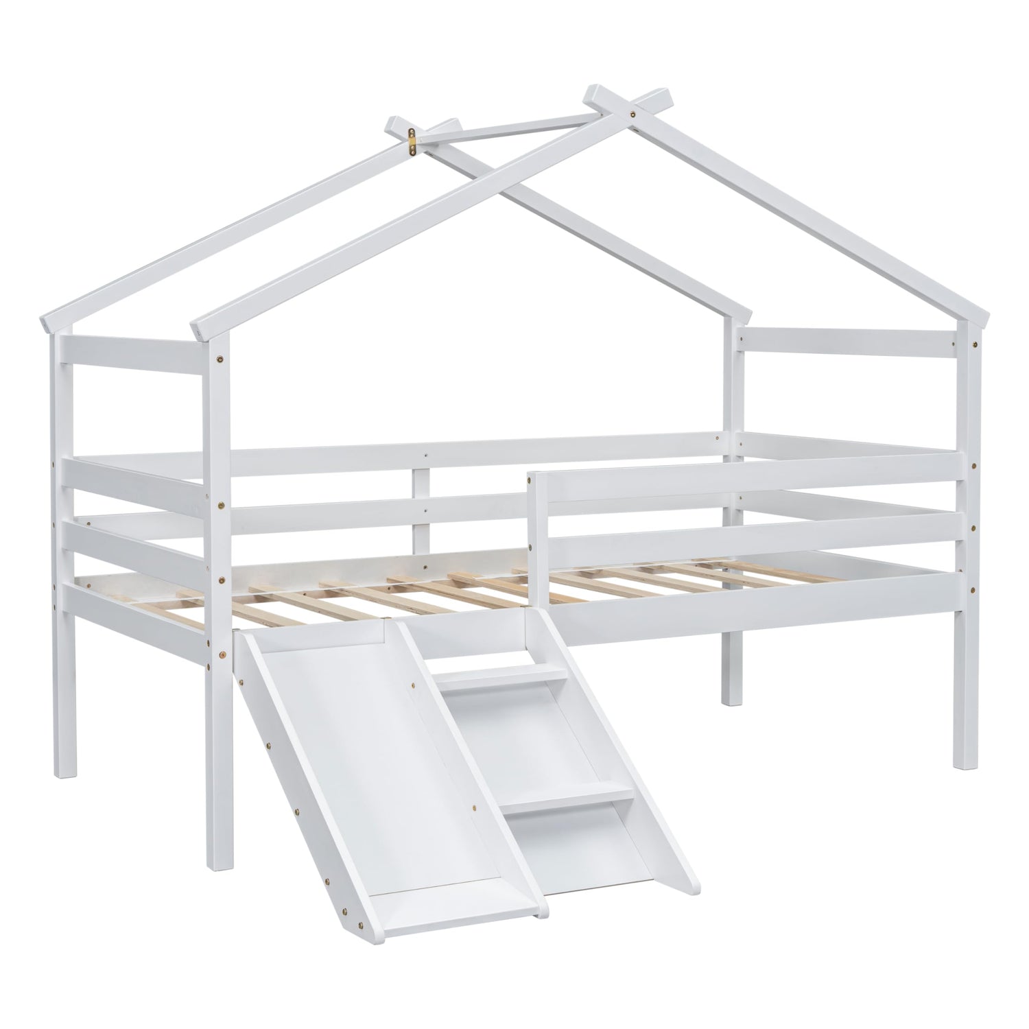 PVWIIK Twin Size Low Loft Bed with Slide for Kids,Girls,Boys Bedroom,Wood House Roof Frame with Inclined Ladder,Easy to Assemble,Under Bed Storage,No Box Spring Needed,White