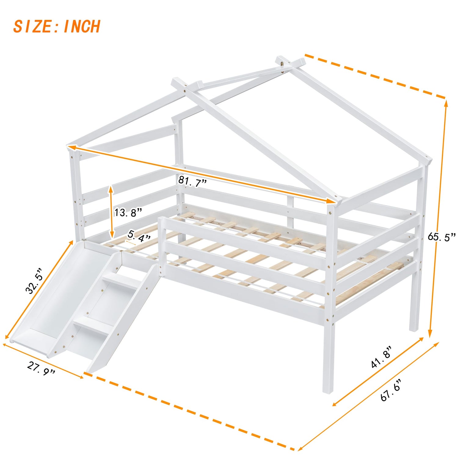 - [Stylistic Elements]The elegance of the bed is reflected from the contemporary minimalistic design of its structure of the paralleled slide and ladder. The unique design of wooden roof frame provides an endless imagination and access to the natural woods to have a fun and go to sleep. Various decorations can be hung up on that wood house frame to accompany a whole sleep and daily activities.