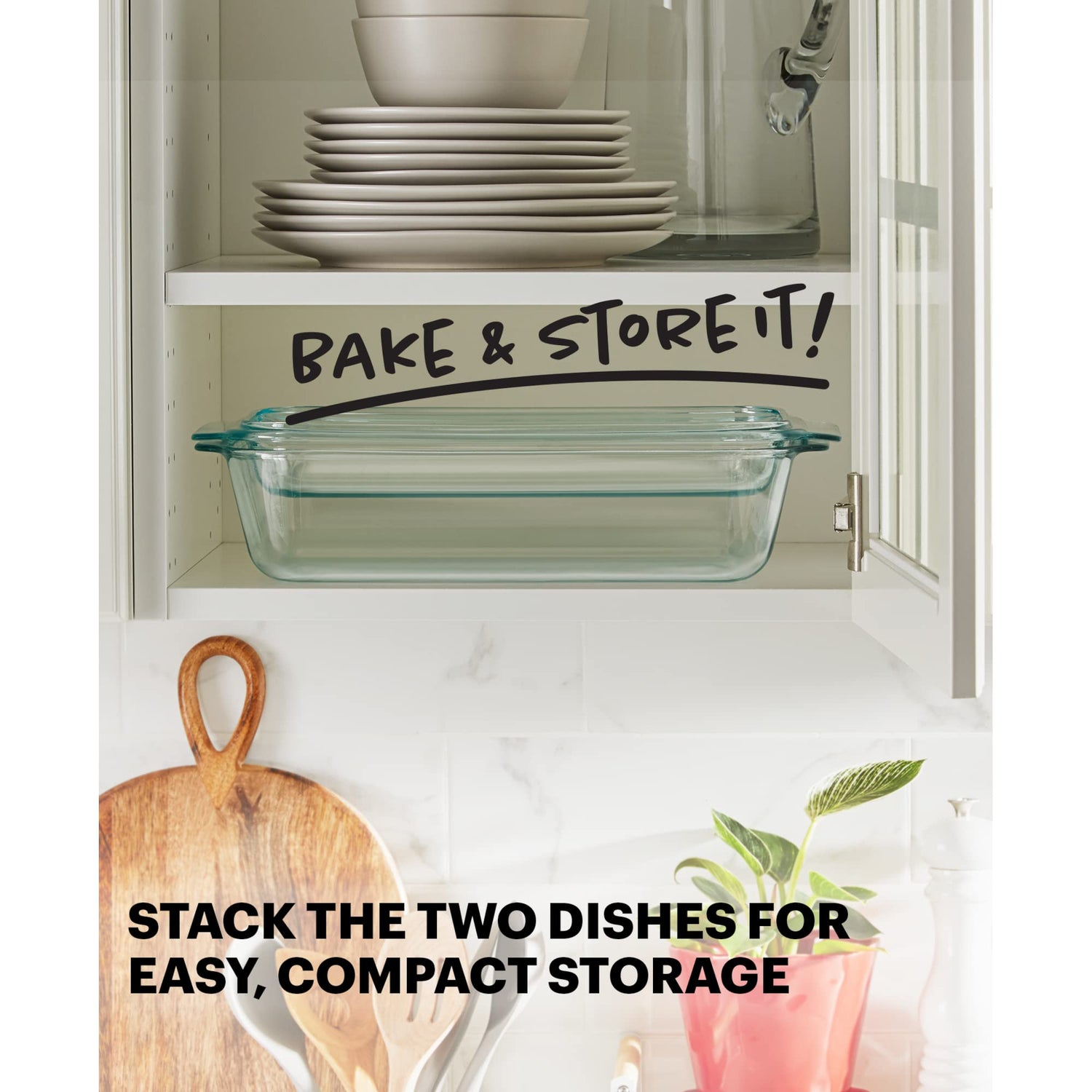 Details: This versatile 2-in-1 set pairs a deep 9x13 baking dish with a glass lid that can be flipped over to serve as a shallow baking dish. Together, they deliver the ultimate in baking performance. The deep dish is perfect for dishes like lasagna and roasted meats. The shallow baking dish is great for both savory and sweet thin baked goods. The tempered Pyrex glass can go directly into a preheated oven, and it heats evenly for consistent results. Stack the two dishes for easy, compact storage. Plus, this baking set is fully sustainable, made from 100% recyclable Pyrex glass.