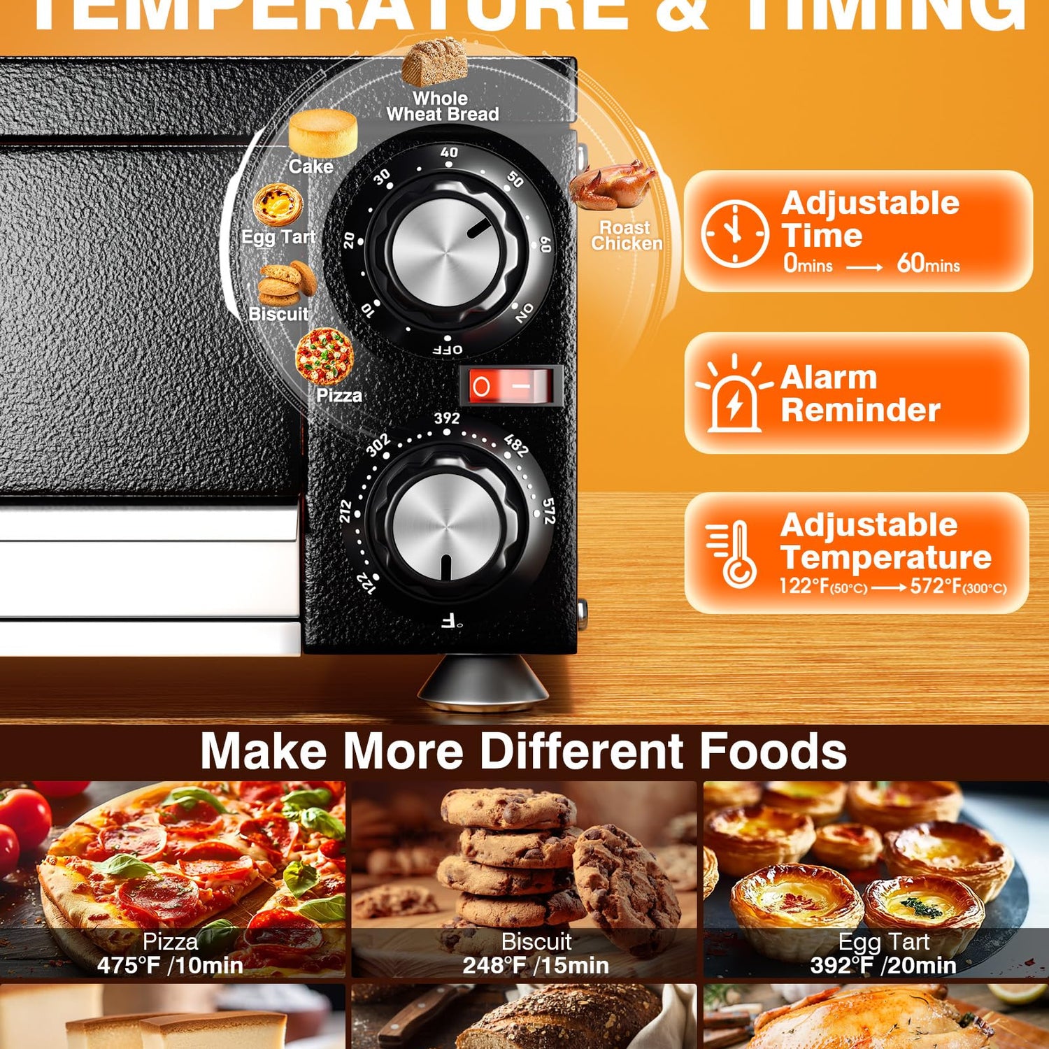 - Customized temperature and time: Adjustable temperature range of 0~572℉(0~300℃), timer of the pizza oven countertop works as alarm when set time is up