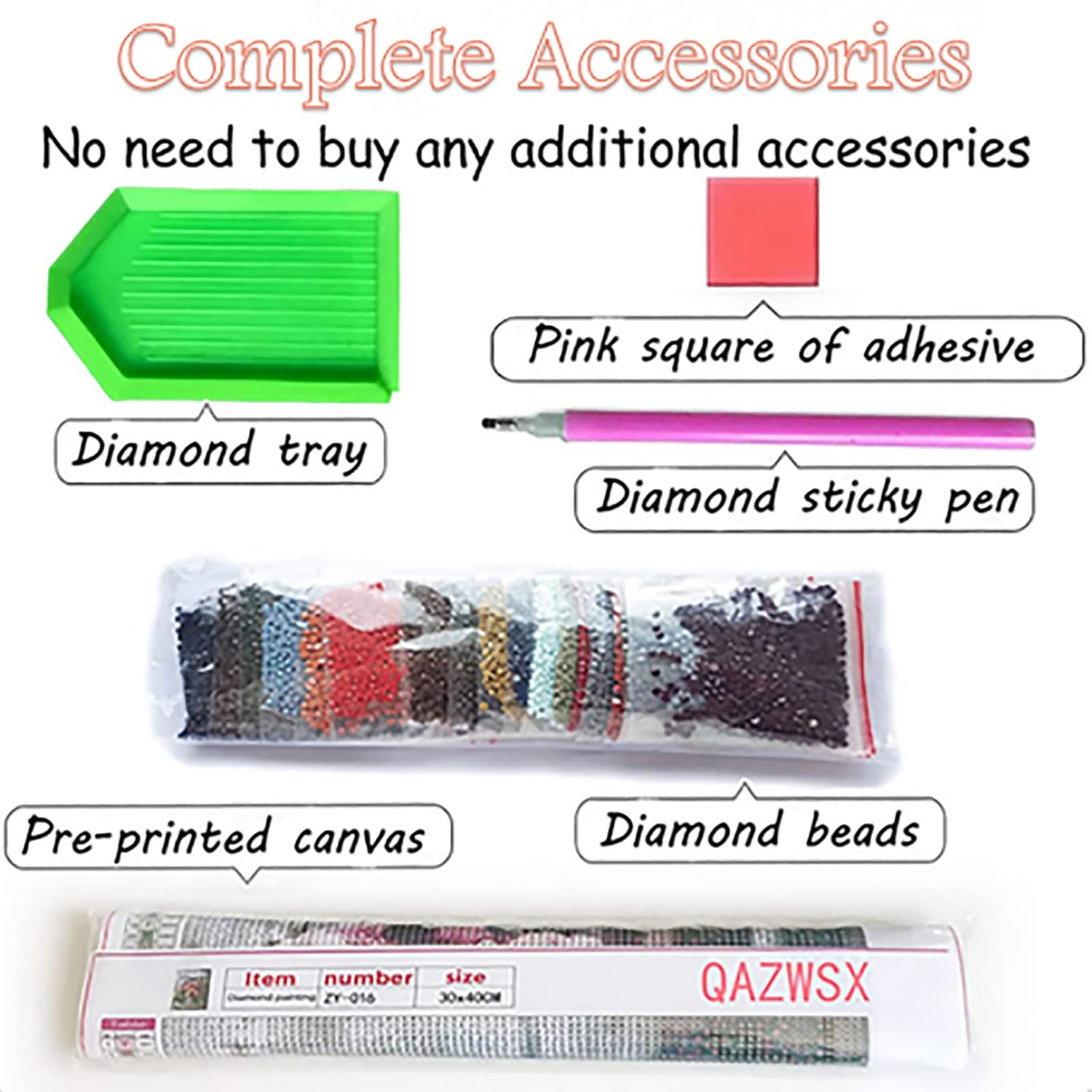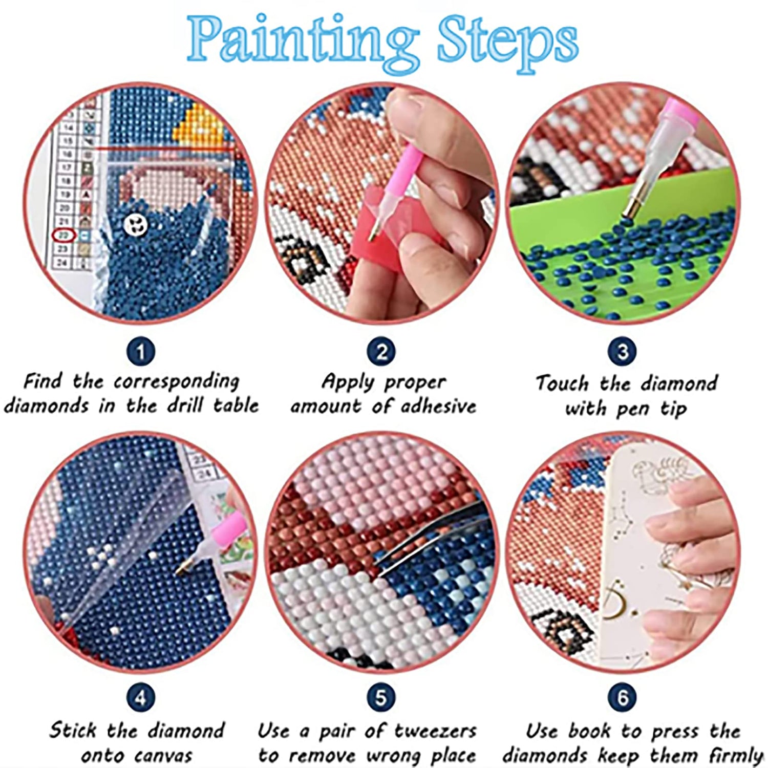 - Easy to Use: The diamond painting set includes all the tools, first place the same diamonds in the tray, then take the pen and lightly rub a little glue so that the pen can absorb the diamonds smoothly, and finally set them on the corresponding numbers on the canvas