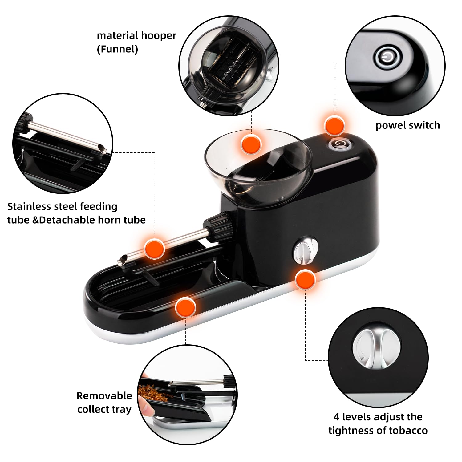 - High quality machine: The electric pre roll/cigarette machine is made of high-quality materials and is durable; Easy to operate design, whether you are a novice or an experienced person, it can meet your filling needs.
