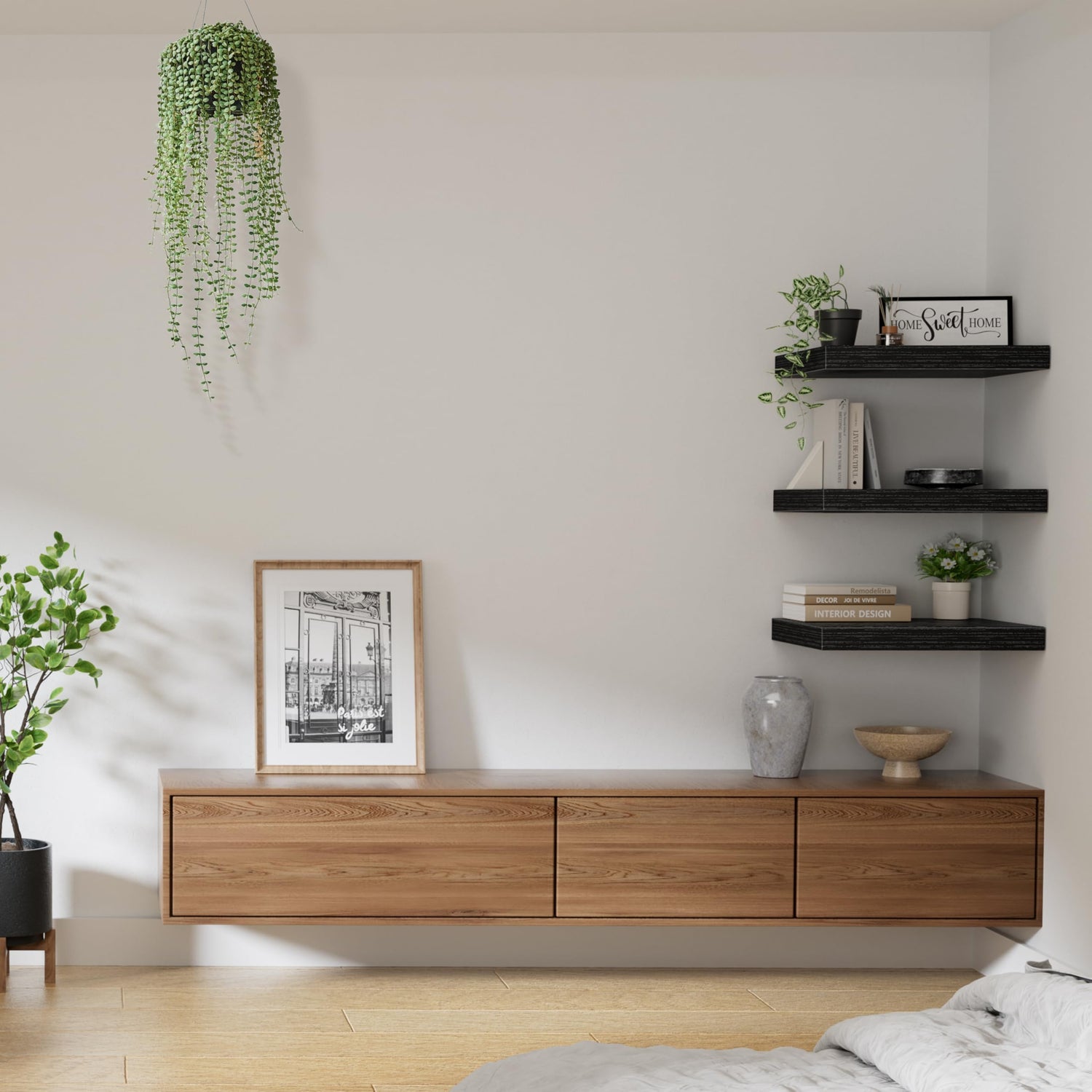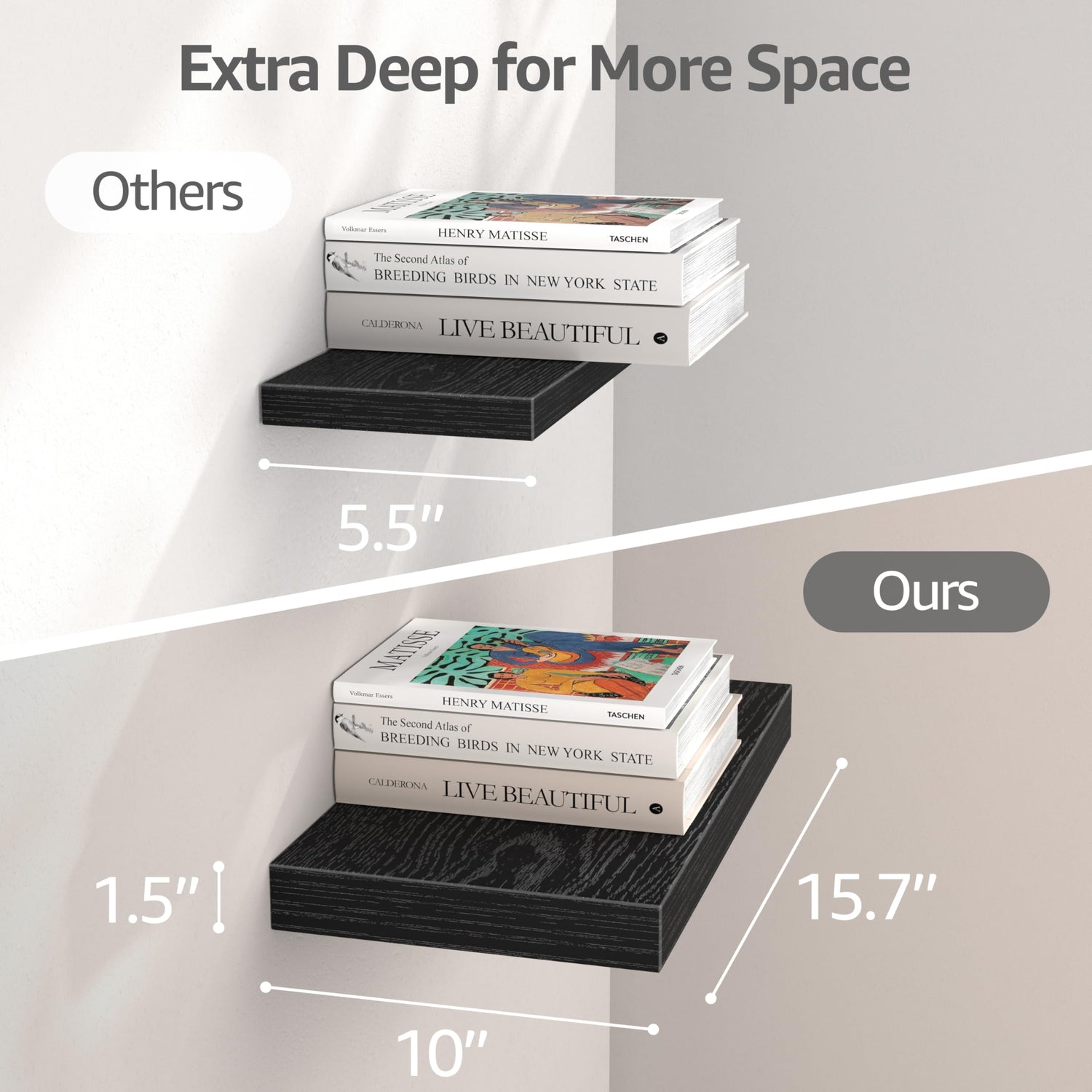 QEEIG 10" Deep Floating Shelves for Wall - 10 x 16 inch Book Shelf Bathroom Bedroom Kitchen Living Room Hanging Bookshelf Farmhouse Set of 3, Black (025-40B3)