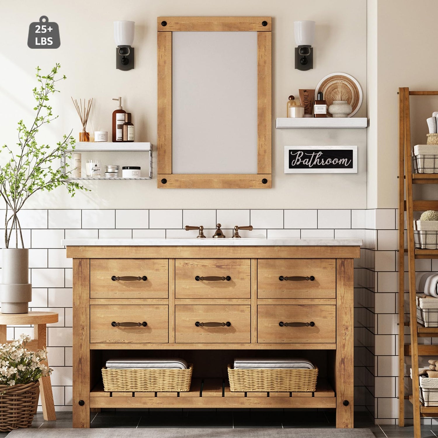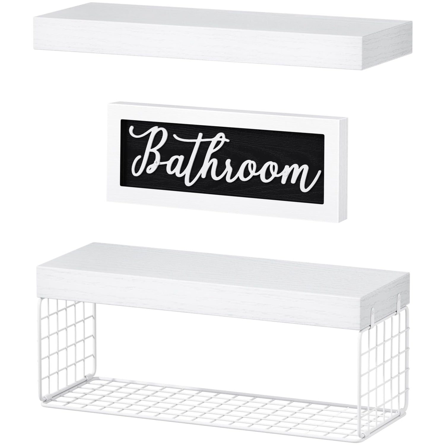 - Patent Design: Create a farmhouse oasis in your bathroom with decor sets! Includes 2 floating shelves, 1 basket, and 1 decorative sign