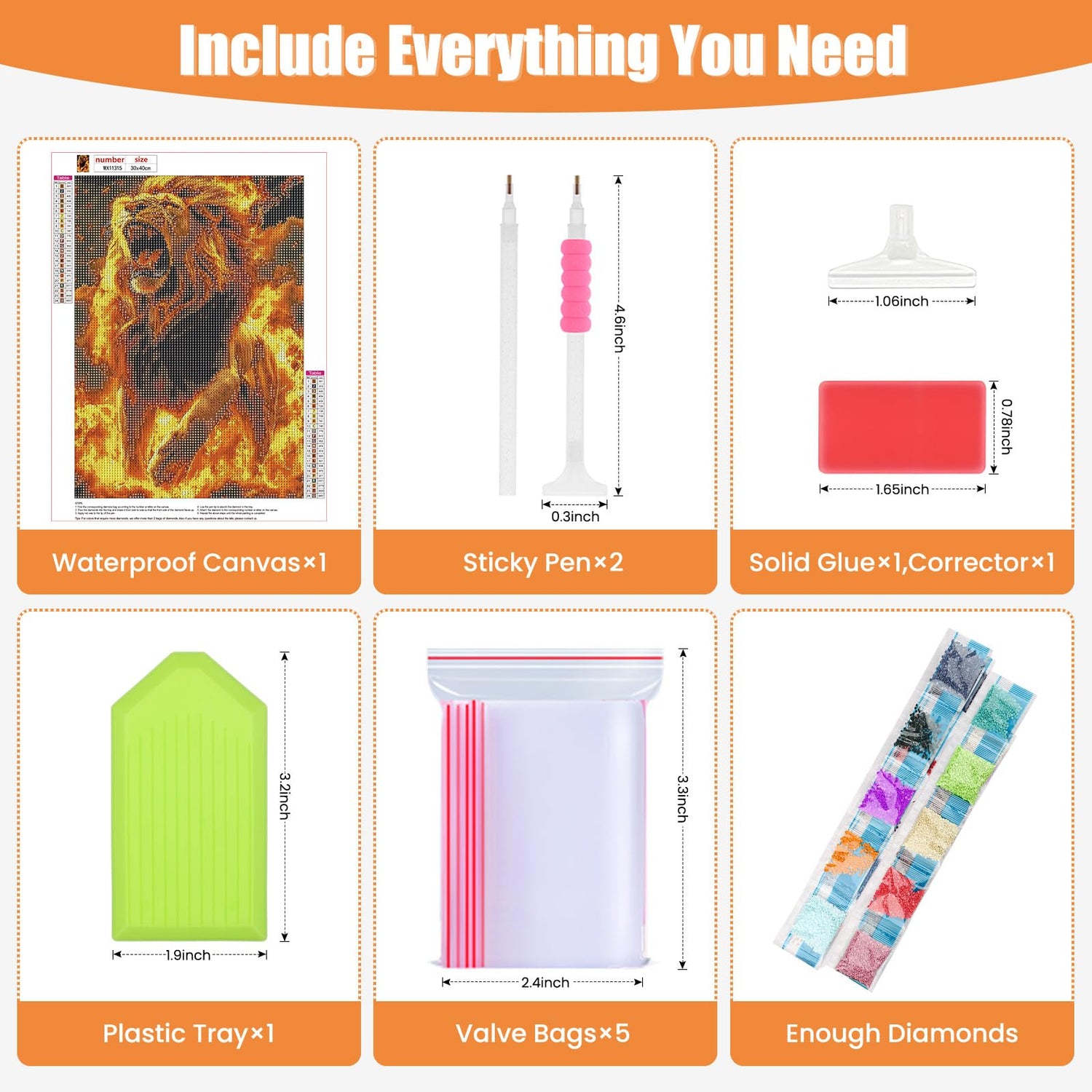 - Contain All Tools - Diamond gem art painting kits contain all tools:1 high definition canvas,1 diamond tray,1 big wax,2 diamond pens,1 replaceable correction pen,5 ziplock bags and enought round diamonds, so you don’t need to purchase any additional tools.
