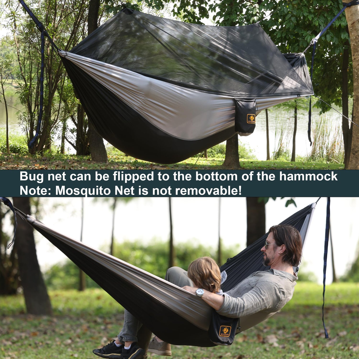 - 【BREATHABLE & PREMIUM NET】: Do you hate being bitten by mosquito while camping? High density nets can effectively protect you from those creepy crawlers. Breathable and ventilated mesh allows you to safely enjoy your camping time. Net and hammock are connected by 2 quality zippers.If you want to know more details about using hammock, please move down on this page to find Product guides and documents, check Safety Information (PDF), you will get more instruction help