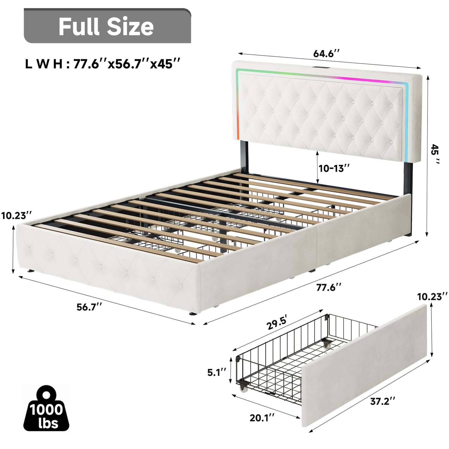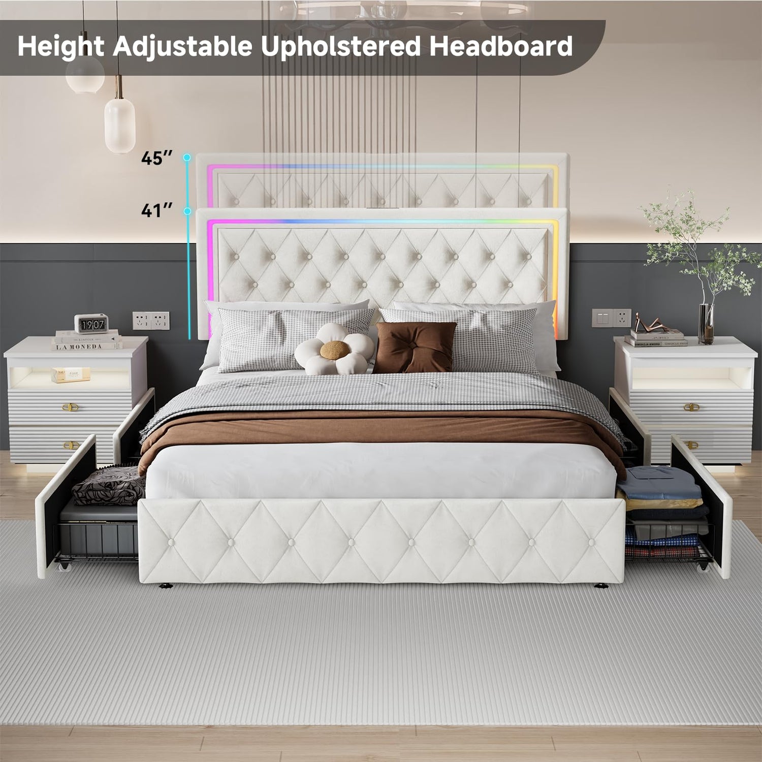 - Full Storage Bed with Adjustable Headboard: The LED full bed frame's headboard is filled with high-density foam and can be adjusted to 41 or 45 inches(2 height options), It's ergonomically designed to provide excellent support and comfort
