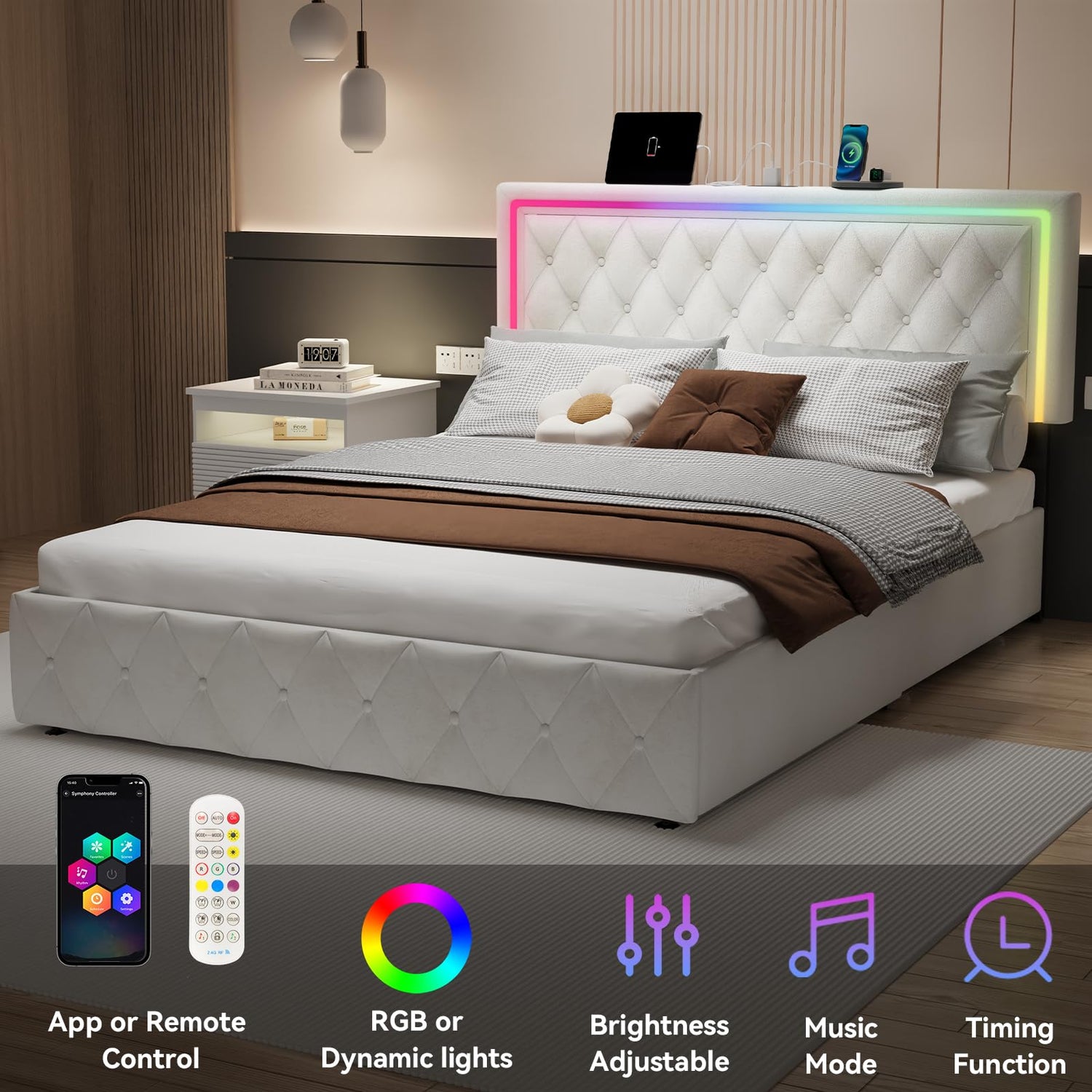 - Cool & Multifunctional LED Lights: The headboard with smart LED lights can be controlled by remote control or mobile app with a variety of timing function, colors, brightness and light modes to choose from, Music Sync mode makes your LED lights flash to the rhythm, create a romantic or dynamic atmosphere for your bedroom