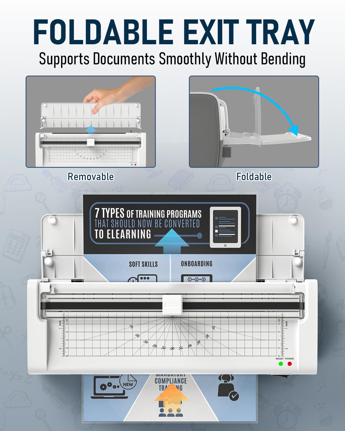 - Back-to-School Season Laminator of Choice: Unlike the regular model, this thermal laminator machine is equipped with a folding tray that precisely guides and supports the paper. This ensures a smooth and even lamination process and prevents paper from warping or slipping. Even fragile certificates, drawings and teaching materials are protected from stains and scratches. This is a reliable protection solution for valuable teaching materials and learning achievements