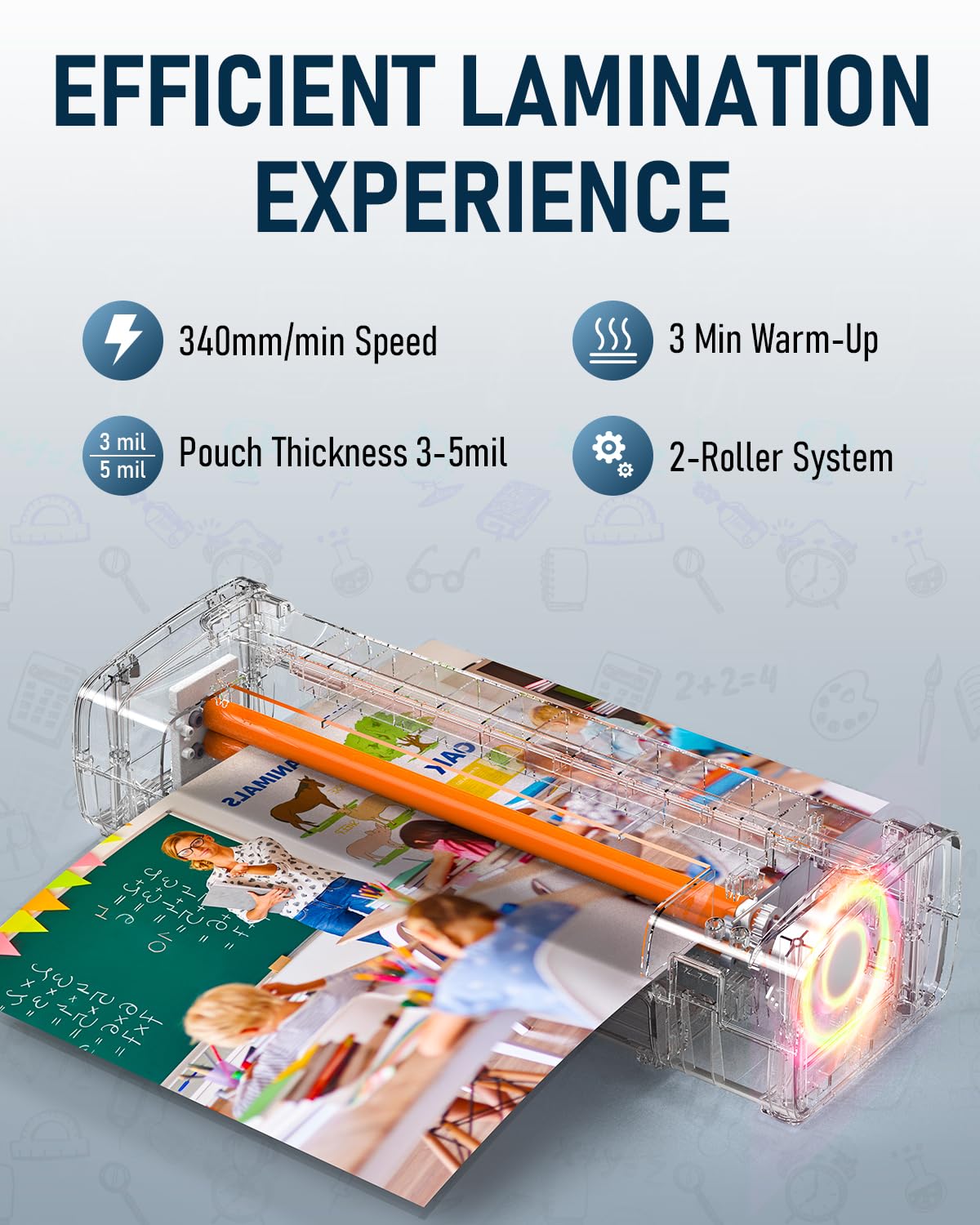 - Quiet No Disturbance, Easy Office: The laminator machine with laminating sheets quickly warms up in just 2 minutes and laminates at a high speed of 340 mm/min, dramatically shortening your waiting time and boosting work efficiency. The advanced silent design allows you to be at home or school without disturbing others. Create a quiet and comfortable working environment while outputting perfect and wrinkle-free finished products