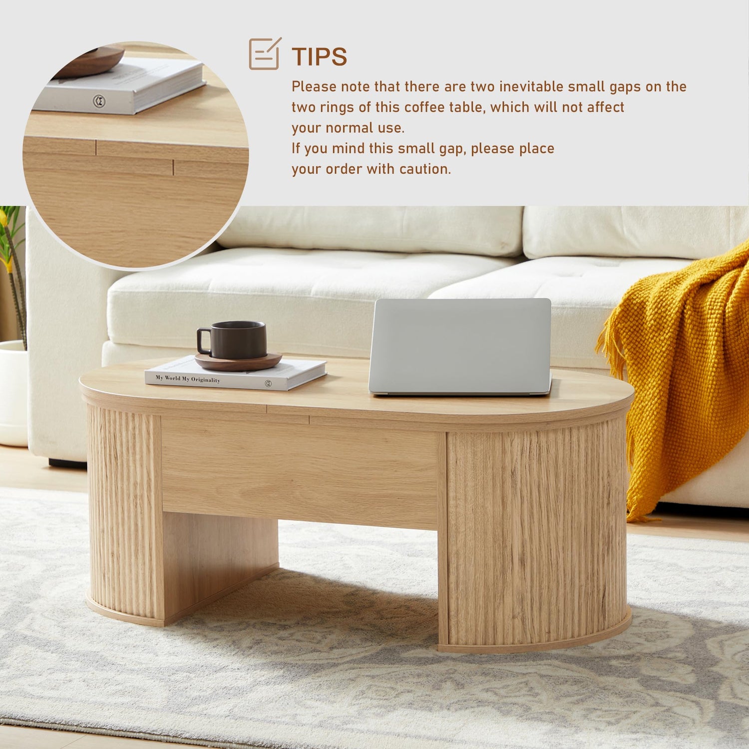 QHITTY Fluted Coffee Table with Lifting Top, Oval Wood Lift Top Coffee Table with Hidden Compartment, Mid Century Pull up Center Tables for Living Room, Office - Natural
