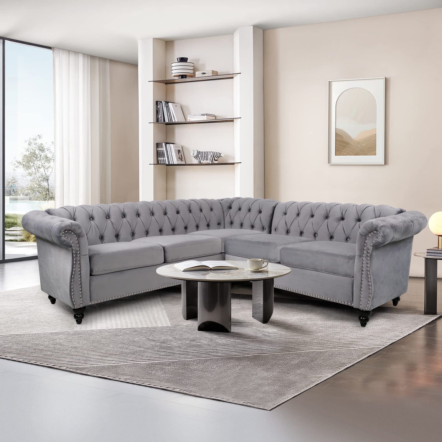 QHITTY L-Shaped Sofa, Sectional Chesterfield Couch 5-Seater Velvet Upholstered Small Accent Tufted Sofa with Rolled Armrest and Nailhead Design for Living Room, Apartment, Office (Grey)