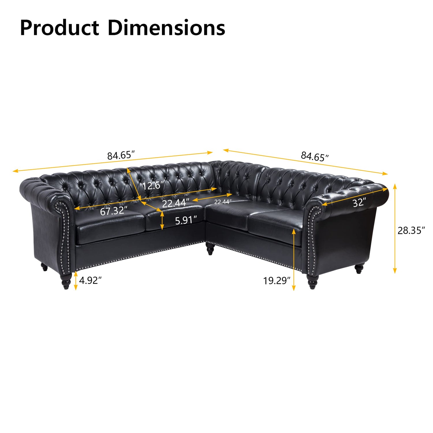 - Easy to Assemble: All the parts are packed in two boxes and easy to install without any tools. Delivery of 2 packages may not arrive at the same time. This chesterfield couch size is 84.65"D x 84.65"W x 28.35"H.