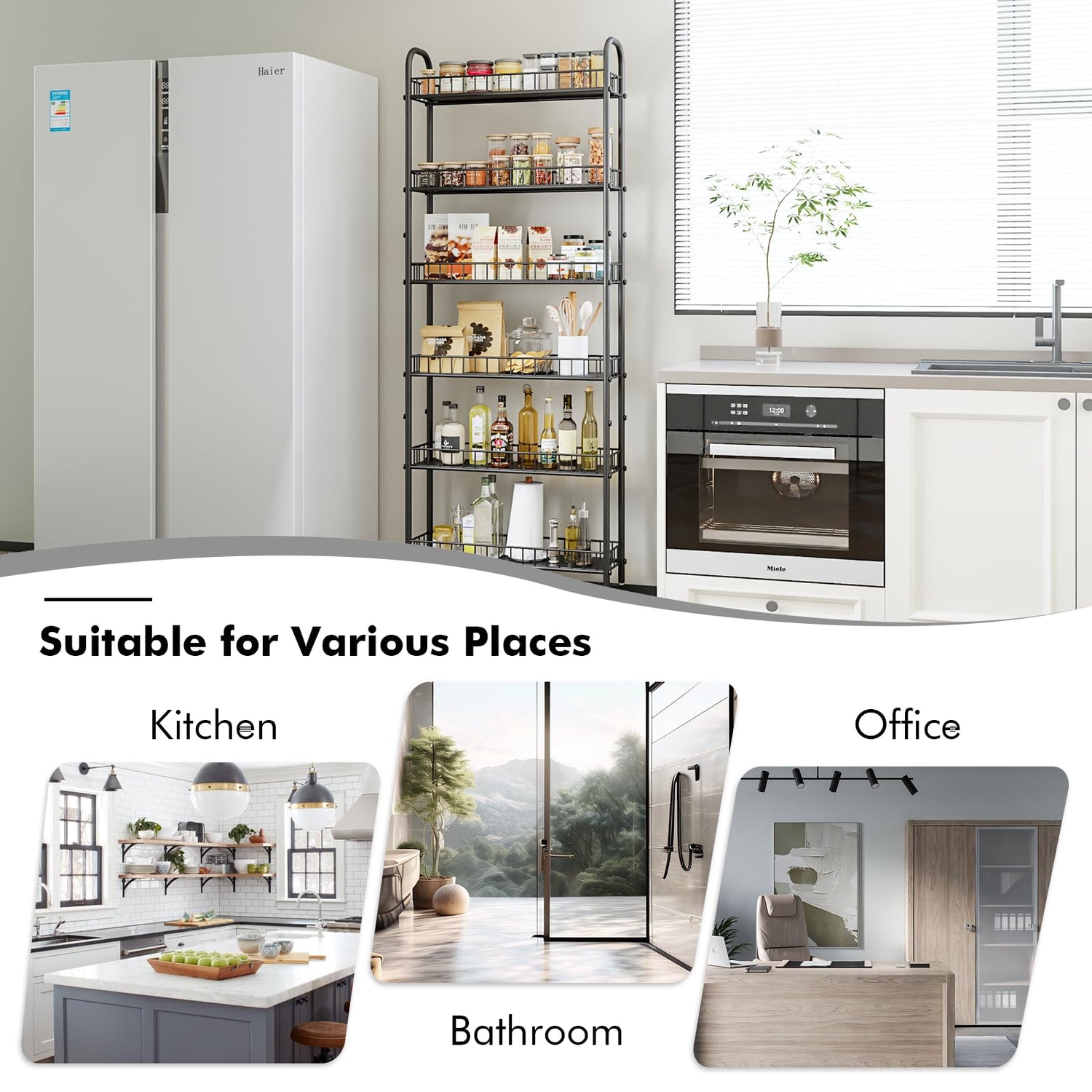 - ROLLING STORAGE CART: The 6 tier slim kitchen organizers and storage cart is 6"/10" design which can be used in tight spaces in your home for storage. Suitable for closets, kitchens, bathrooms, garages, laundry rooms, offices or in-between your washer and dryer.