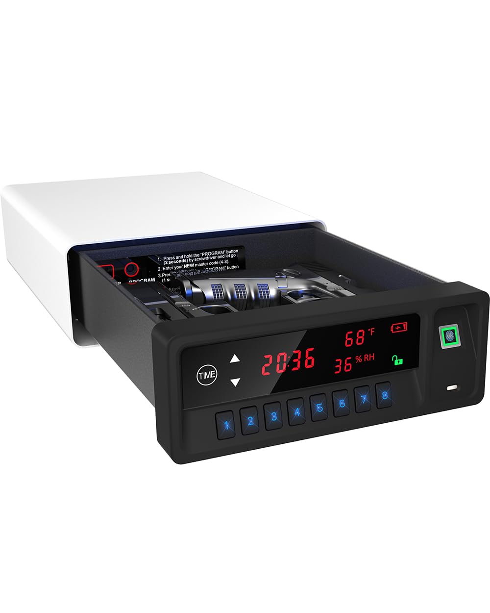 - Clock Safe with LCD Display: QINGENO clock gun safe provides a 30-second on-screen display, which goes out after 30 seconds. The gun safe for handgun displays the current time, humidity, temperature, low battery warning, and whether the biometric safe is open or closed