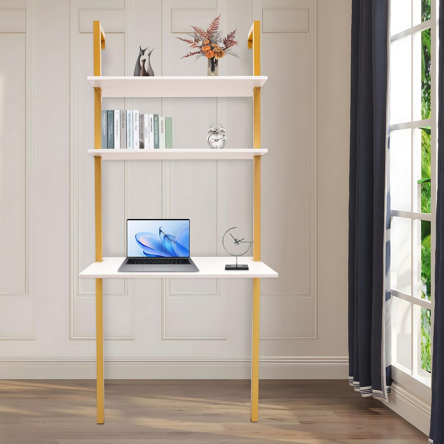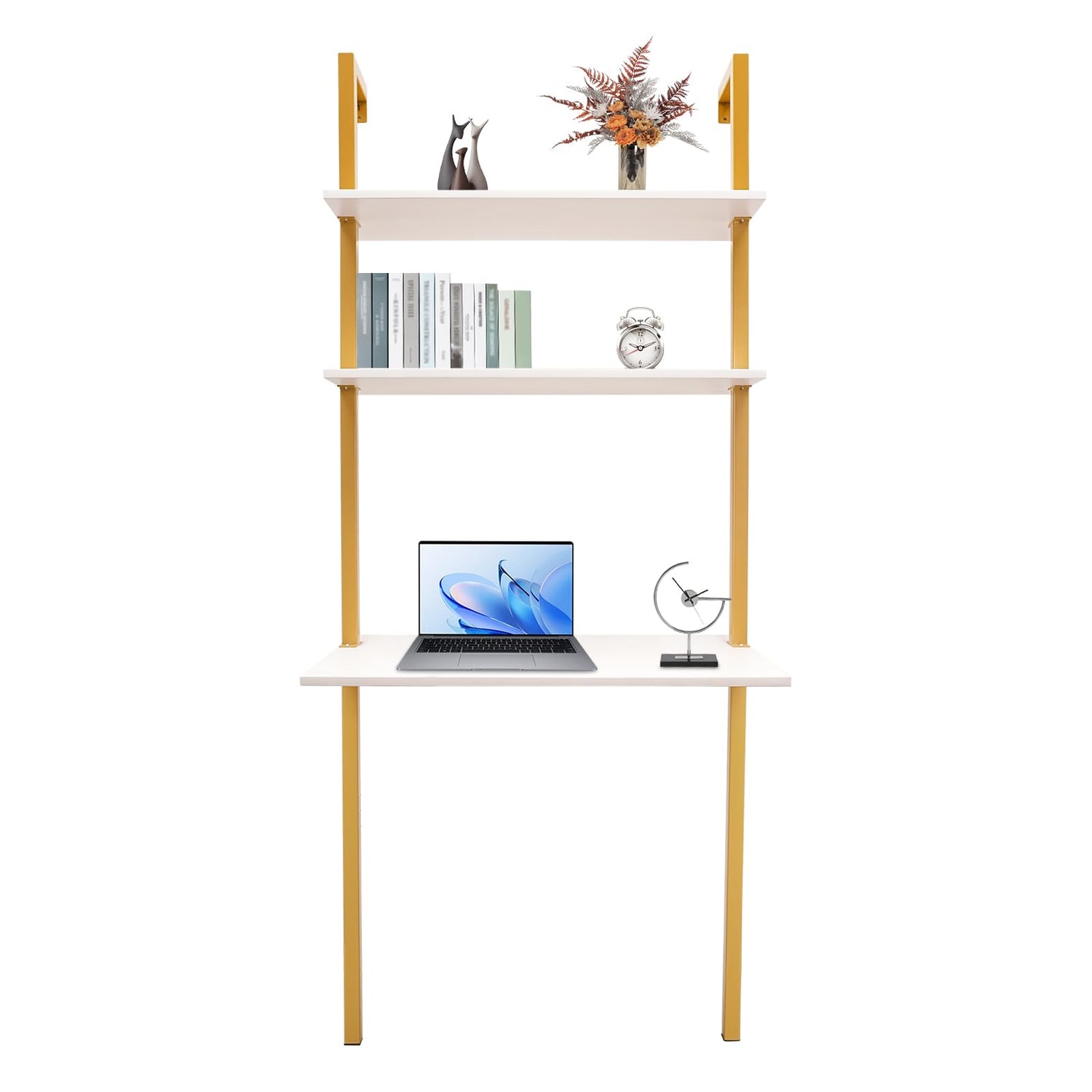QIUTMER Wall Mount Desk 3 Tiers Wall Table Wall Mount Computer Writing Table Industrial Bookcase Desk Gold and White for Homes Office School