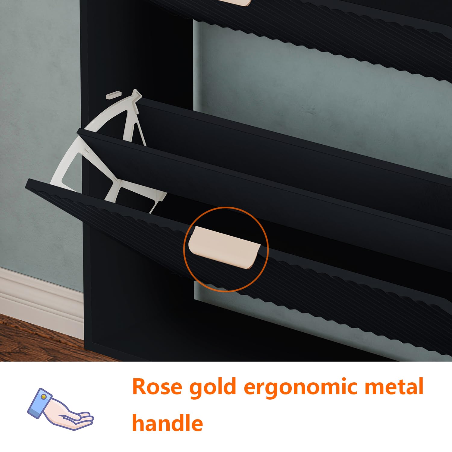- Unique Artistic Shoe Cabinet:This modern shoe cabinet features a wood grain finish and rose-colored metal handles, which not only accommodates your shoes but also protects them from dust and chewing by pets. It's perfect for a hallway, living room, or porch.