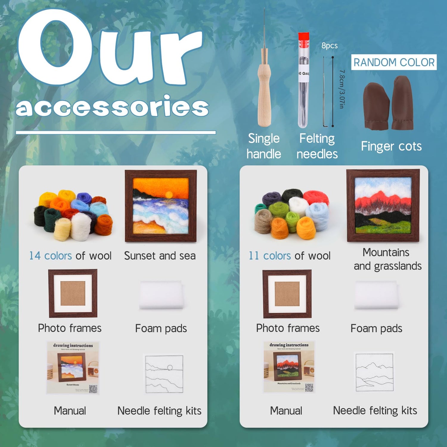 - Needle Felt Painting Kit: The needle felting picture kit contains 2 wool material bags, 8 pcs needle felting needles, 2 photo frames, 2 foam pads, a single wooden handle tool, felt clothes, and detailed instruction manuals, which is enough to meet your needs