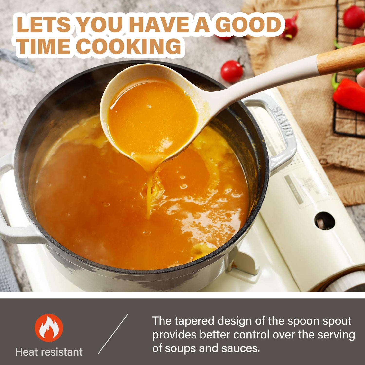 QMVESS Large Silicone Cooking Utensils Set 7 Pcs Heat Resistant Kitchen Utensils Set Food Grade Silicone and Wooden Handles Spatula Soup Ladle Pasta Server Kitchen Scissors BPA Free (Khaki)