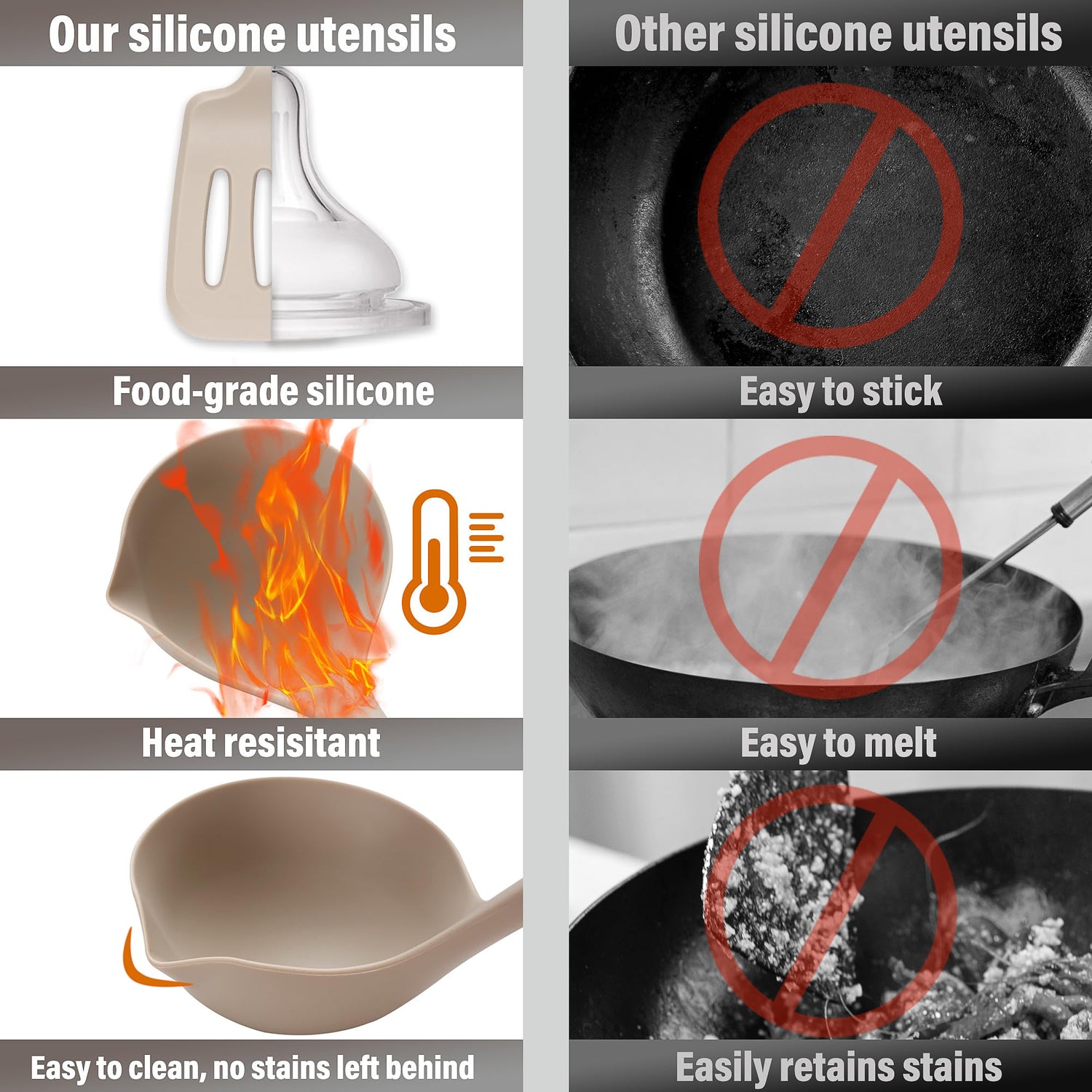 - HEAT-RESISTANT, NON-MELTING SOFT SILICONE SPATULA SET: One of the best things about silicone cooking utensils is their ability to safely withstand heat, each kitchen utensil is heat resistant up to 446°F and will not melt. Even after being left in the pot for a while, our spatula heads won't melt, warp or buckle. With the added softness of the all-around silicone head, there's no more worrying about food sticking to your cookware or scratching your non-stick cookware or expensive pans
