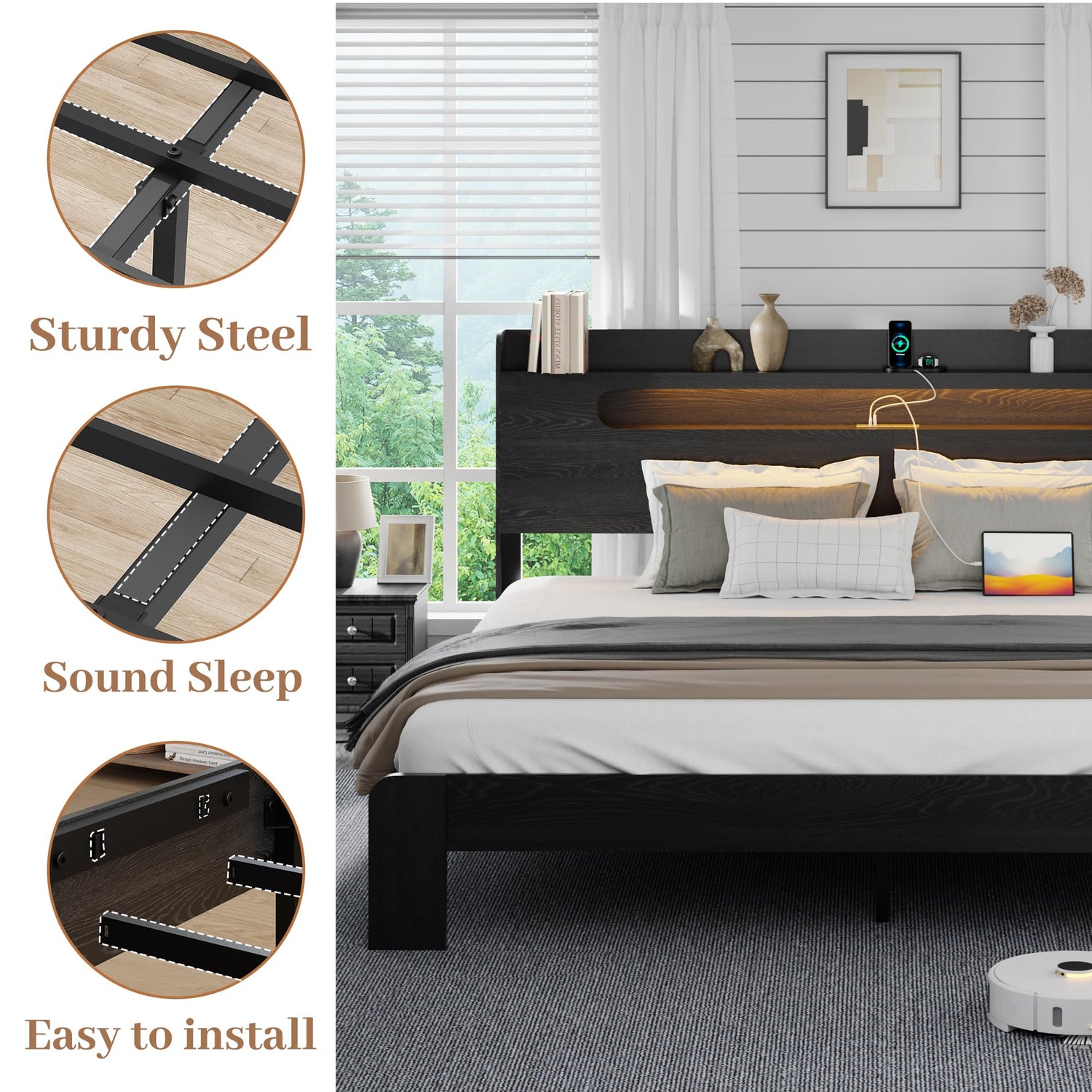 QNICE Wooden King Size Bed Frame with Storage Headboard & Charging Station, Farmhouse Platform Bedframe with LED Lights & Metal Slats Support, Easy Assembly (Rustic Black)
