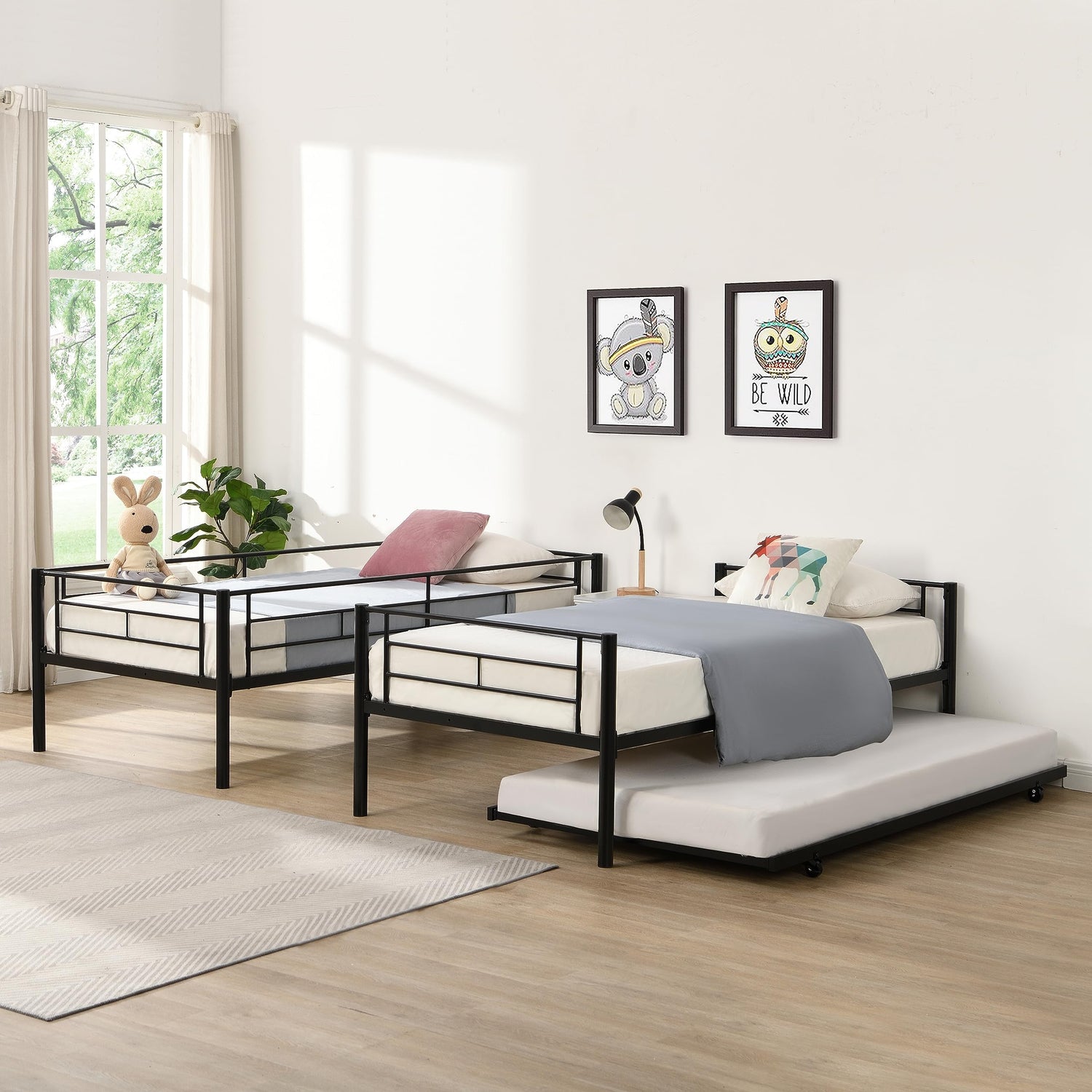 - Space Saving Bed Frame :With Pull out trundle bed,this twin-over-twin metal bunkbed is great in saving space for compact place.Without cumbersome spring box, trundle under the lower bunk bed gives you extra sleeping space.Very ideal for school dormitory ,company dorm room ,and home apartment etc.Overall Product Dimension: 78.00"L x41.50"W x65.20"H.Mattress not included.Some assembly is required