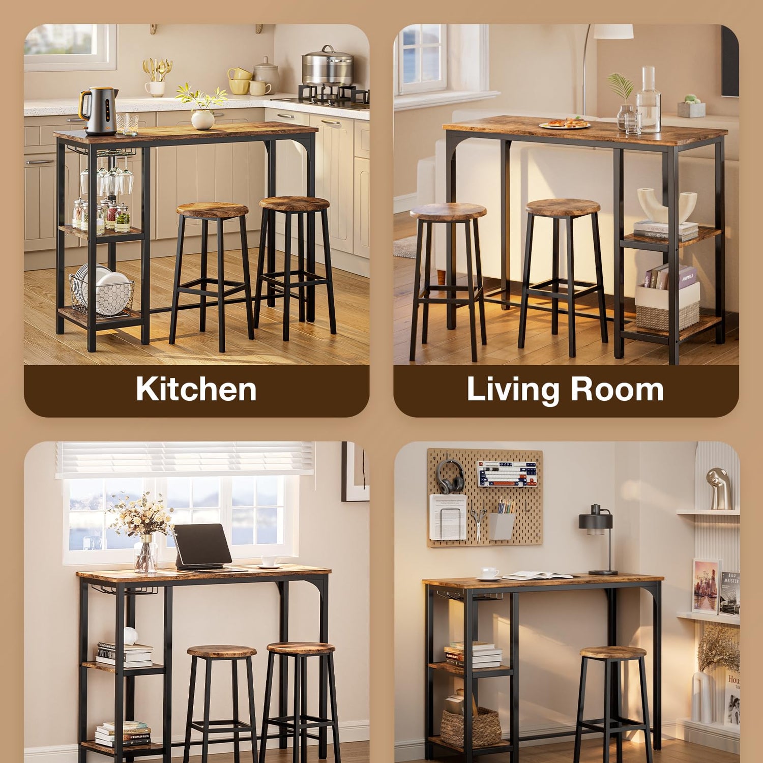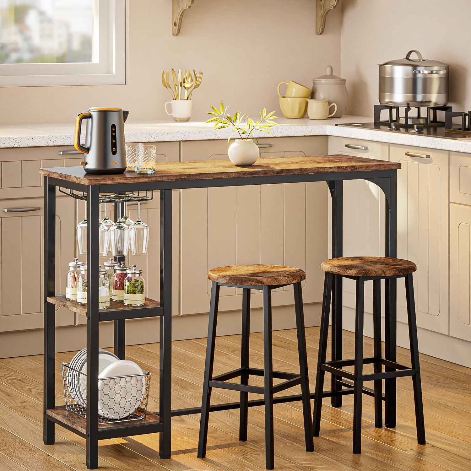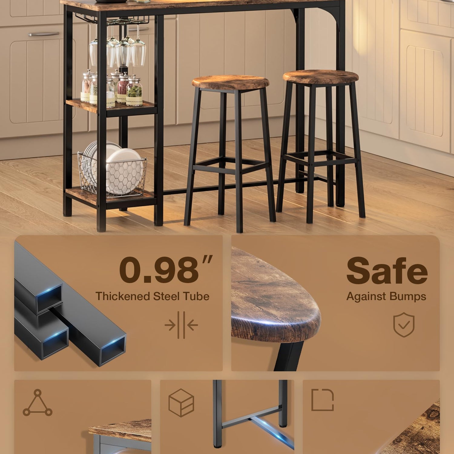 - Ample Storage Space: Bar table with stools creates ample storage in a limited space. To make the bar table versatile, the table is specially designed with two-layer storage space and 2 rows of wine glass rack. You can store kitchen utensils, food as needed