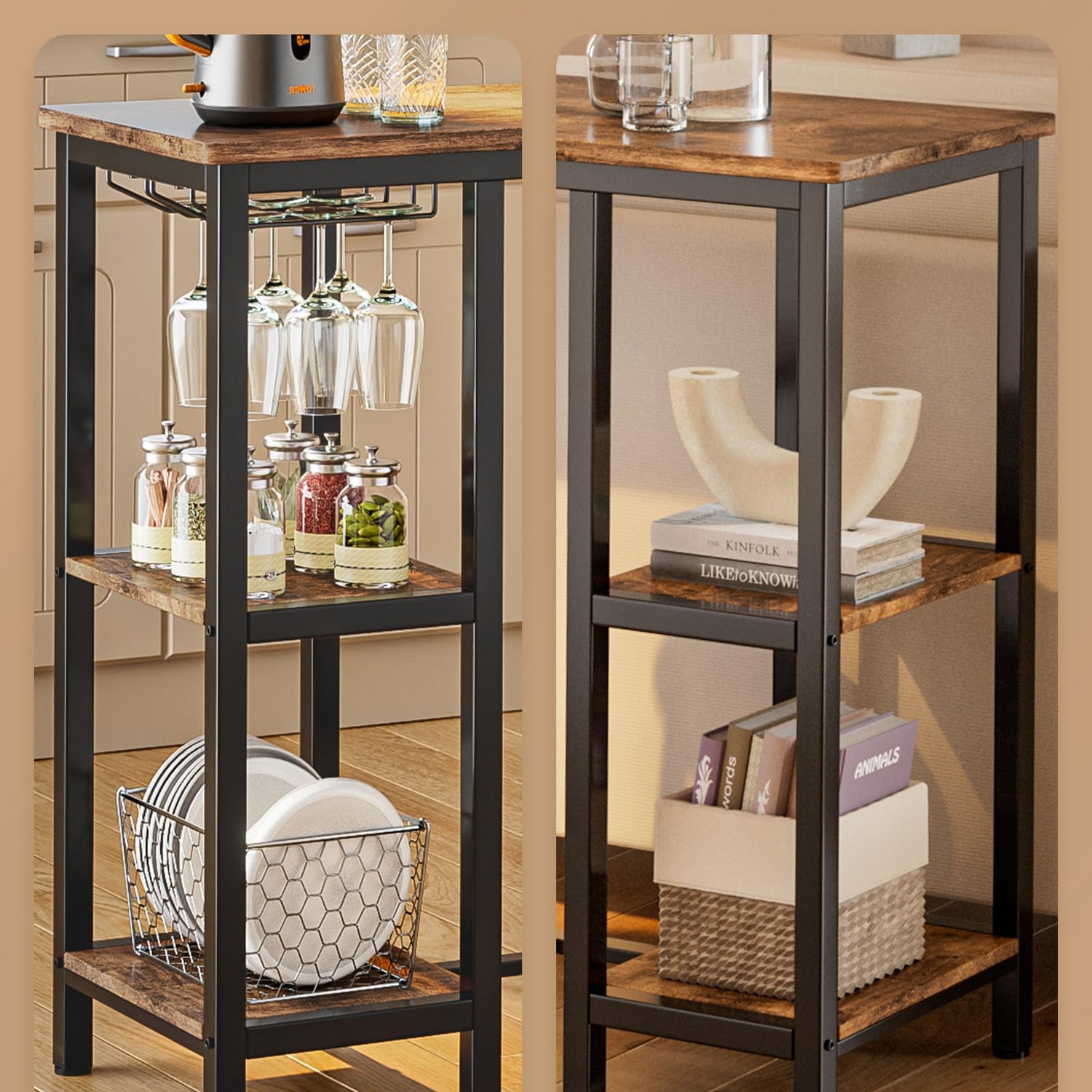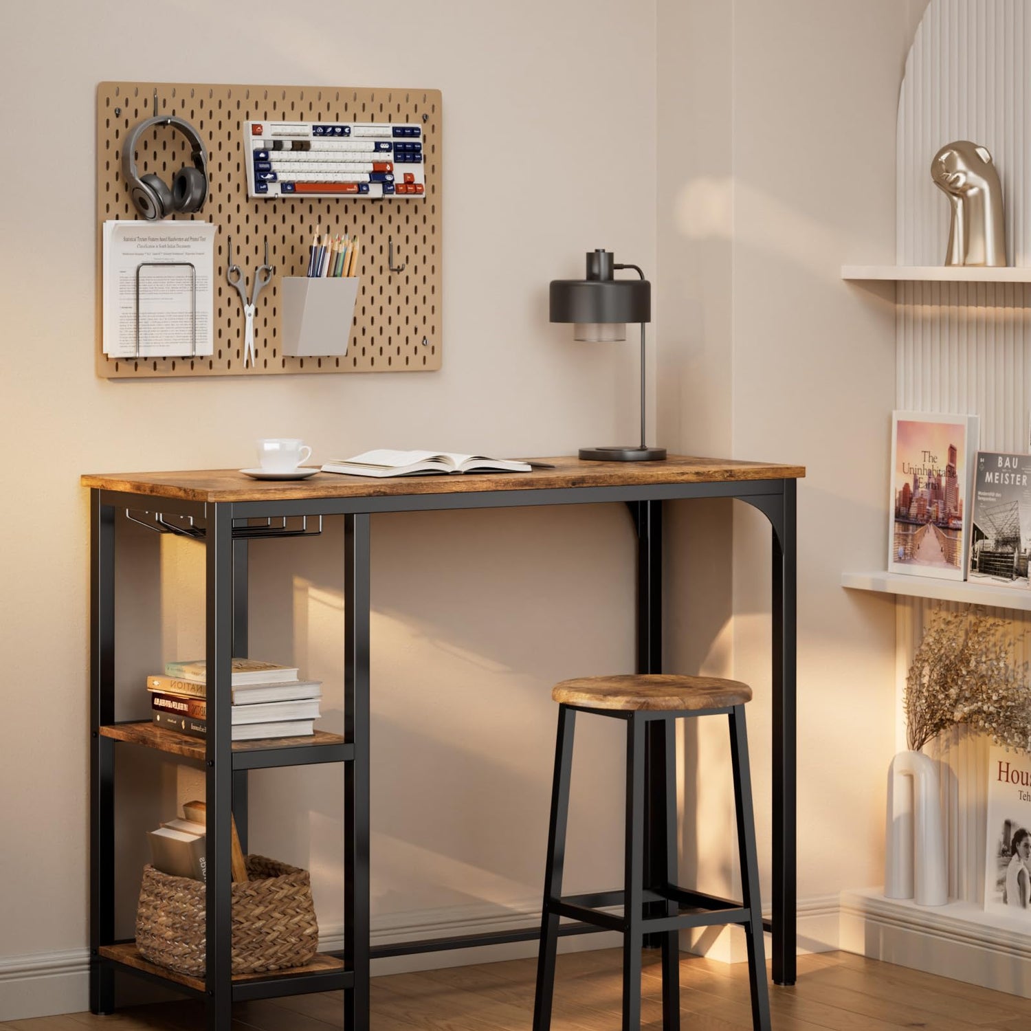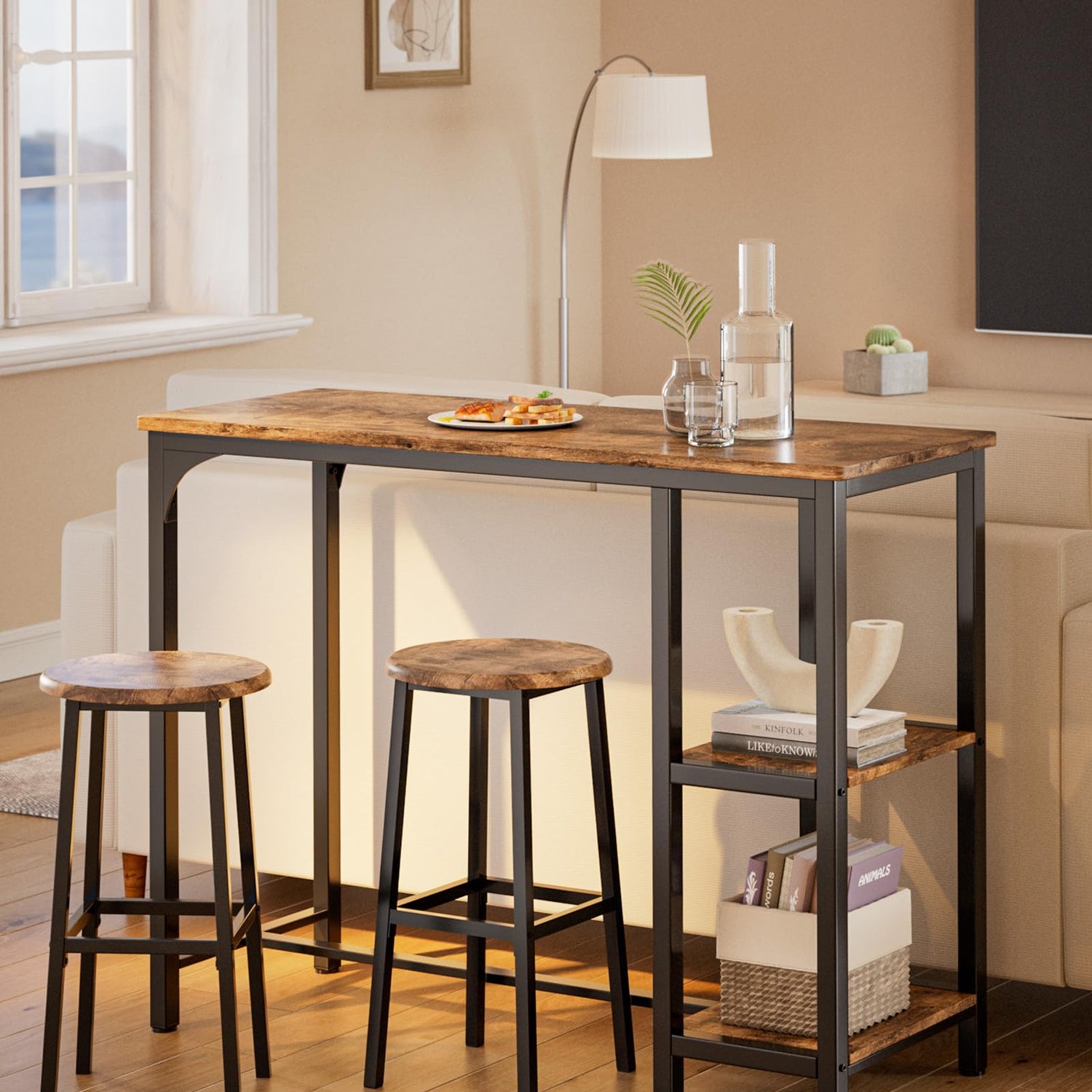 - Ample Storage Space: Bar table with stools creates ample storage in a limited space. To make the bar table versatile, the table is specially designed with two-layer storage space and 2 rows of wine glass rack. You can store kitchen utensils, food as needed