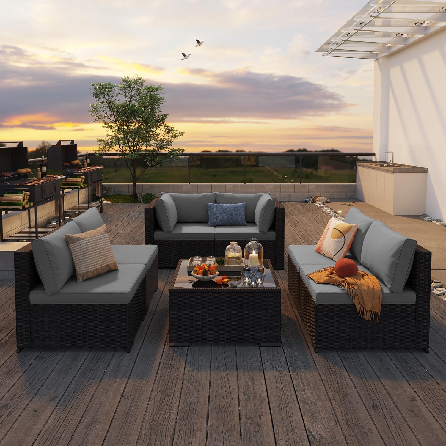 Qsun 7-Piece Outdoor Sectional Patio Furniture Set, PE Rattan Outdoor Furniture Patio Conversation Set with Cushions and Glass Coffee Table (Brown Rattan, Grey Cushion)