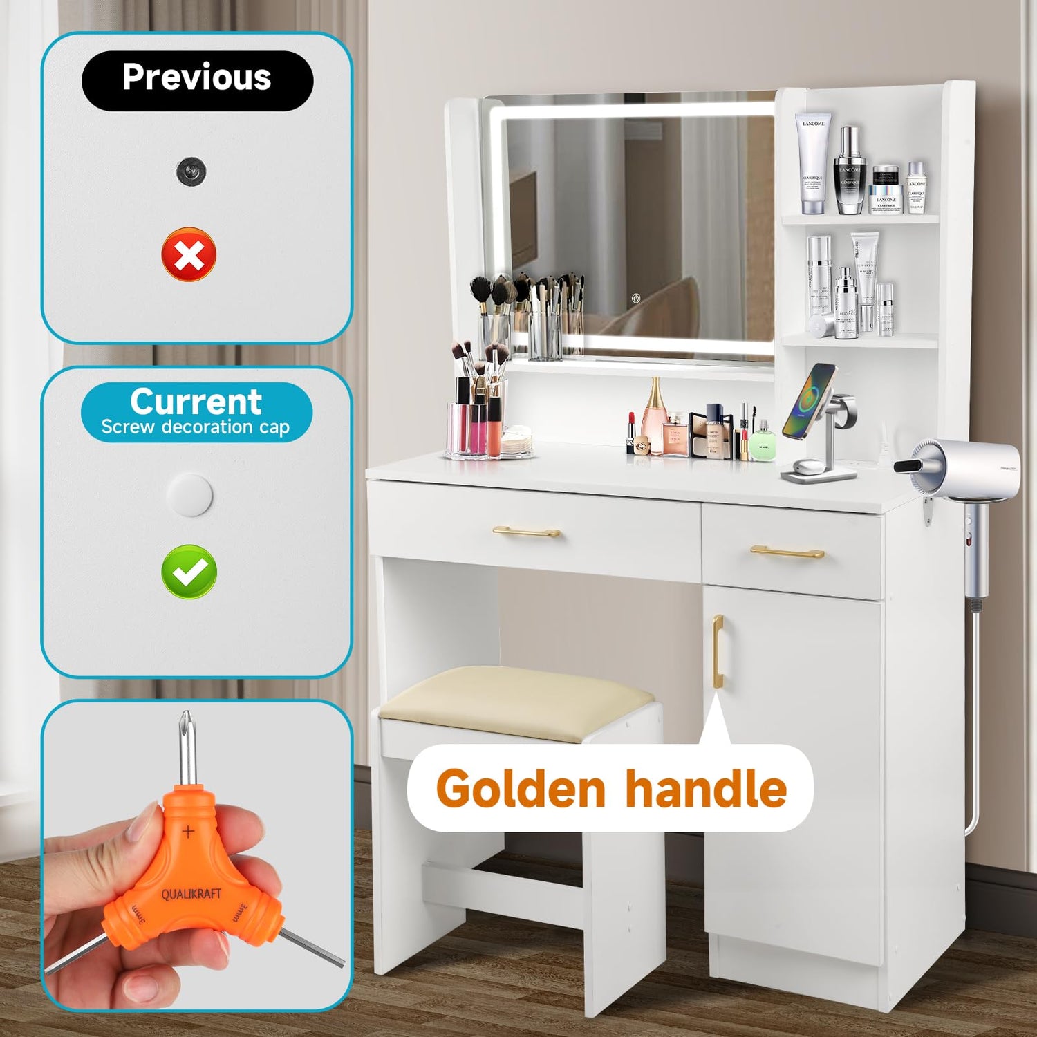 - 【Comfort & Safety】The white vanity is made of high-quality materials, easy-to-clean surface, vanity with mirror, with strong load-bearing capacity and stability. The white vanity desk with mirror and lights is firmly fixed to play a role in safety protection. Simple, elegant and stylish, this vanity with mirror and lights with a golden handle that matches perfectly with the rest of your furniture and adds stylish charm to your room. The vanity desk with chair is very comfortable, which allows you and your family to better sit and make up without feeling tired.