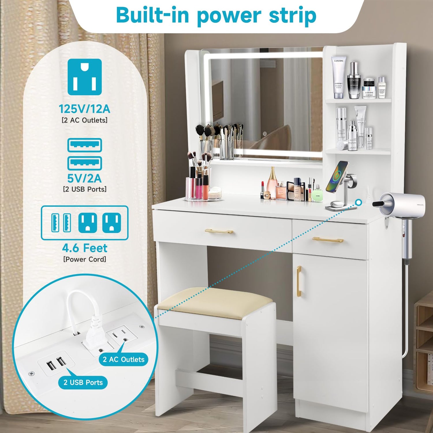 - 【Built-In Power Outlet & Hair Dryer Rack】 The vanity with outlet for easy to use hair curlers, hair dryer, beauty instruments, mobile phone charging. Vanity with power outlet for more versatility. The vanity set with mirror and stool and lights is very rugged, does not take up too much space, offering you a complete makeup experience. This white vanity with lighted mirror allows you and your family to dress better and be more beautiful and confident.