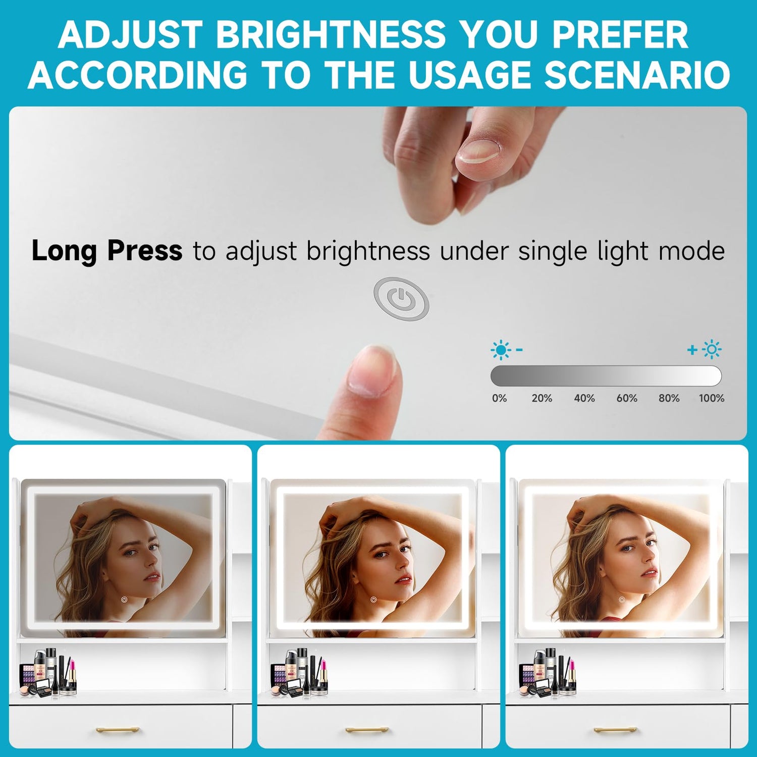 - 【Large Mirror with Adjustable Brightness】The style of the makeup vanity desk with lights is very beautiful, fine workmanship, no odor, led mirror vanity can be perfectly matched with the room, adding an elegance and warmth to the home. This vanity mirror with lights desk, the brightness of the light can be adjusted, long press touch switch can be adjusted to suit your needs. The make up vanity mirror with lights can let women better see their face and cosmetics, make makeup more elaborate. This makeup desk is the best festival gift for daughter, wife, lover, girlfriend, it also makes a great festival gift for anniversaries, birthdays, Valentine's Day, Mother's Day, Christmas, and New Year.