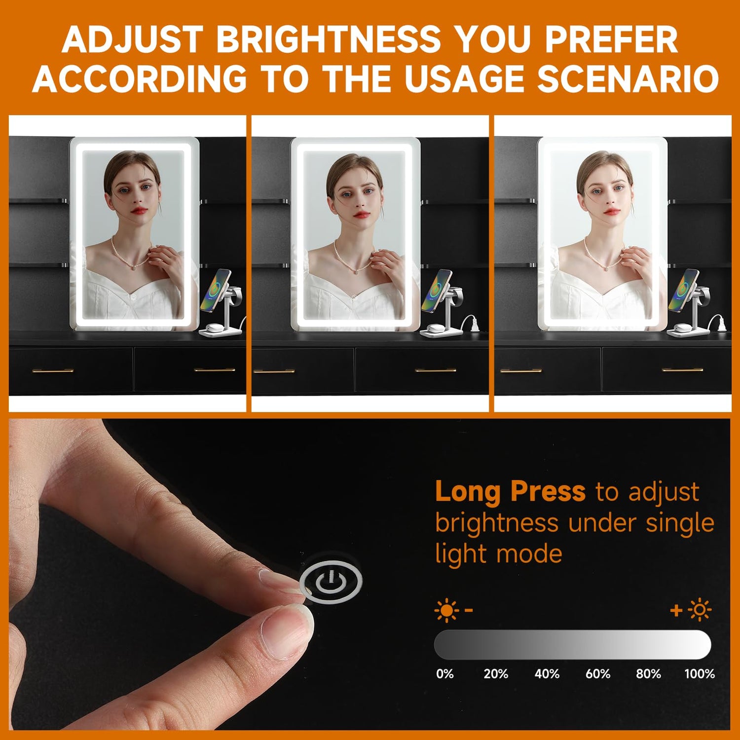 - 【Large Mirror with Adjustable Brightness】The black vanity,led mirror vanity adds a unique charm to your space. And the vanity mirror with lights desk and chair is especially comfortable to shine on. makeup vanity with lights, the brightness of the lights is adjustable, a long press on the touch switch adjusts the brightness to suit your needs.Having a vanity with mirror and lights helps you to clean up your face, and the makeup vanity desk is fully functional. Every woman wants to have a good vanity desk. This black vanity set is the best festival gift for daughter, wife, lover, girlfriend, it also makes a great festival gift for anniversaries, birthdays.