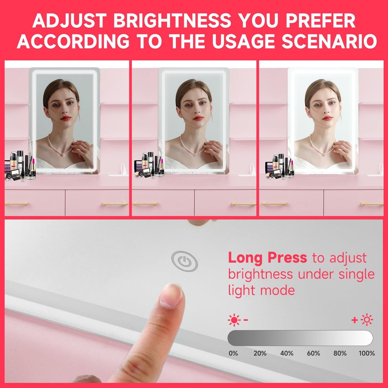 - 【Large Mirror with Adjustable Brightness】The pink vanity,led mirror vanity adds a unique charm to your space. And the vanity mirror with lights desk and chair is especially comfortable to shine on. makeup vanity with lights, the brightness of the lights is adjustable, a long press on the touch switch adjusts the brightness to suit your needs.Having a vanity with mirror and lights helps you to clean up your face, and the makeup vanity desk is fully functional. Every woman wants to have a good vanity desk. This pink vanity set is the best festival gift for daughter, wife, lover, girlfriend, it also makes a great festival gift for anniversaries, birthdays.