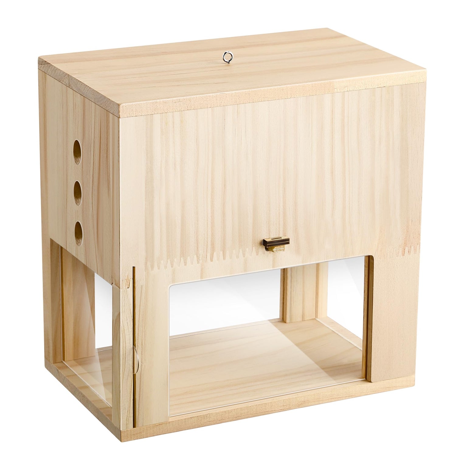 - Easy to Use: The 2 in 1 design of the wood boring bee trap makes it easier to use, the clear acrylic container makes it easy to observe the capture of carpenter bee, and when transporting the bees for relocation, you can open or close the latch on the capture chamber, take the trap to a remote location, and then open the door of the simple room to set them free